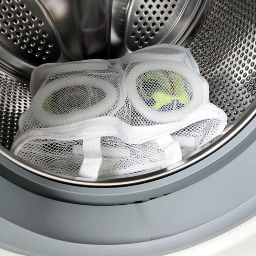 Geantă practică din plasă pentru spălarea pantofilor. Protejează perfect încălțămintea împotriva deteriorării în timpul spălării la mașină. Este echipată cu închidere cu fermoar și bucle practice, care permit agățarea pantofilor până la uscare.