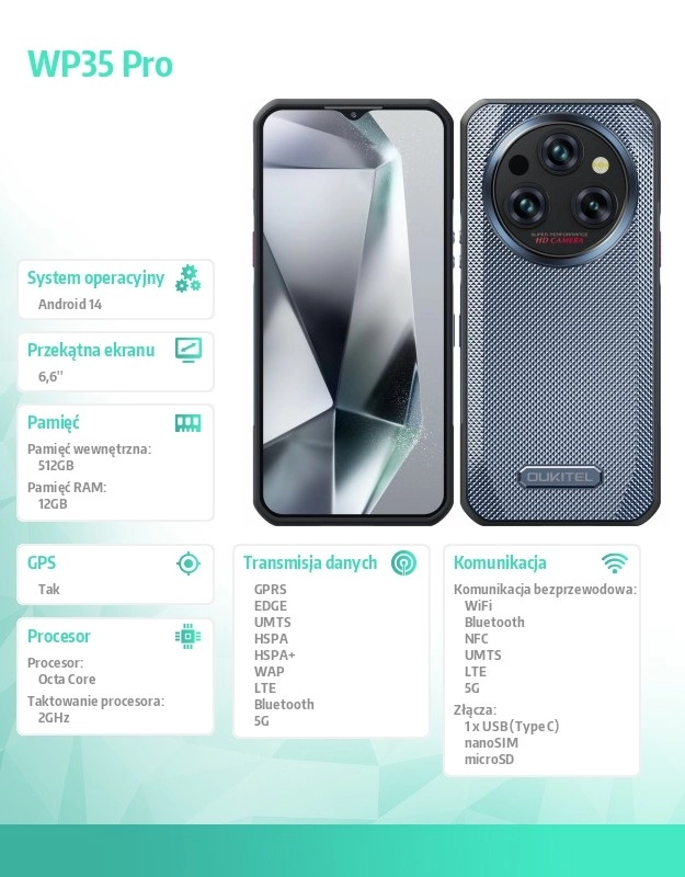Căutați un telefon care să reziste la utilizare dură și ieșiri lungi fără încărcător? OUKITEL WP35 Pro 5G combină o baterie masivă de 11.000 mAh și unul dintre cele mai subțiri corpuri rezistente din clasa sa (15,2 mm). Datorită ecranului 6,6" FHD+ Gorilla Glass 5 obțineți imagini clare și rezistență la zgârieturi, în timp ce 5G și chipsetul MediaTek Dimensity 6300 (8 nuclee, 2,2 GHz) asigură funcționare fluidă.