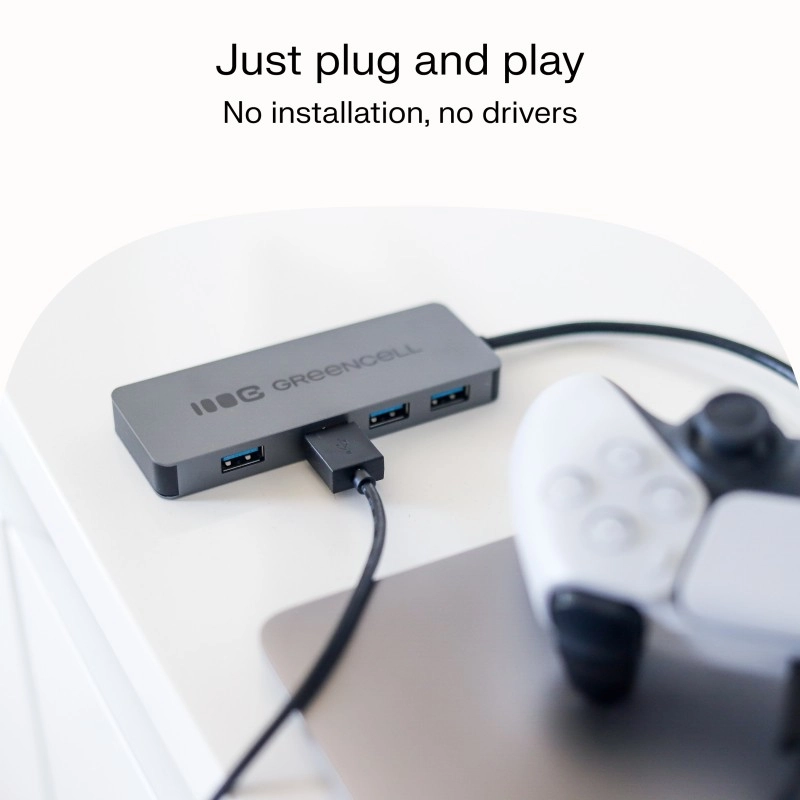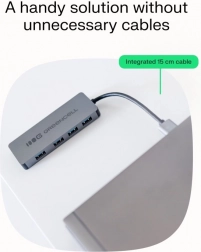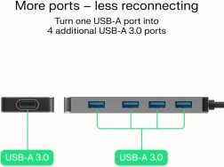 Aveți nevoie să conectați mai multe dispozitive simultan? Acest hub USB compact transformă un port USB-A în patru porturi rapide USB 3.0. Vă permite să conectați în mod fiabil stickuri USB, tastaturi, mouse-uri, cititoare de carduri și hard diskuri externe, menținând spațiul de lucru ordonat.