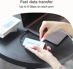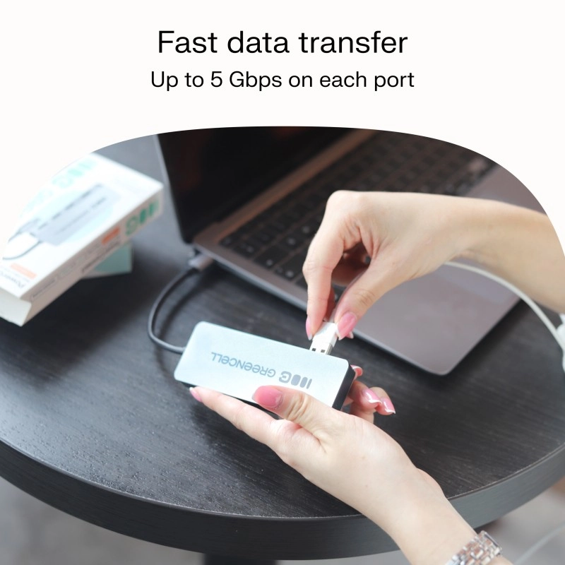 Transformați un port USB‑C în patru USB‑A 3.0 fiabile. Conectați stick-uri USB, tastaturi, mouse-uri și unități externe și lucrați comod fără reconectări constante. Fiecare port oferă viteză de date de până la 5 Gb/s pentru copiere și sincronizare rapide.