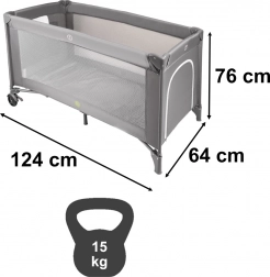 Acest pătuț de călătorie este ideal pentru vacanțe, vizite și utilizare zilnică acasă. Construcția durabilă, cu cadru încrucișat stabil în formă de X și două roți cu frână, permite deplasarea facilă, în timp ce picioarele antiderapante oferă siguranță pe orice suprafață. Laturile din plasă asigură o ventilare excelentă și vizibilitate constantă asupra copilului.