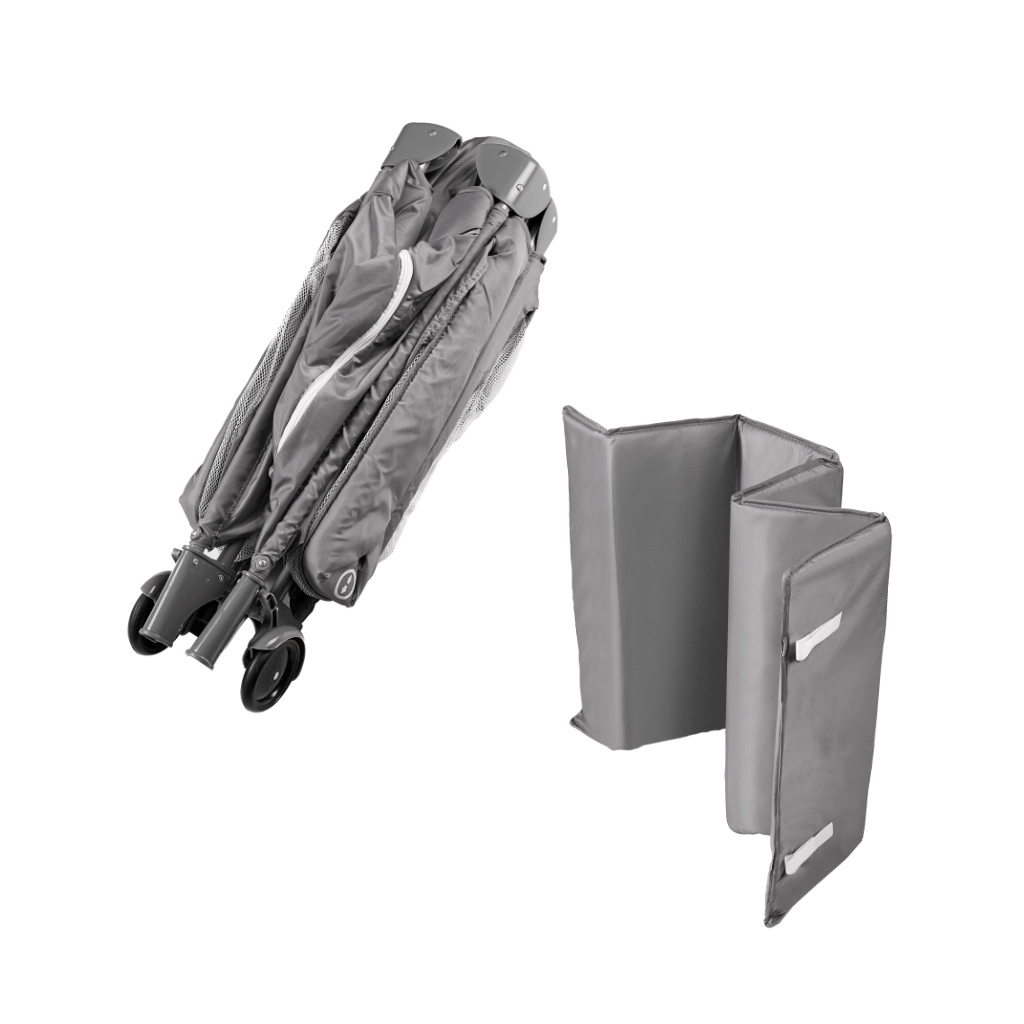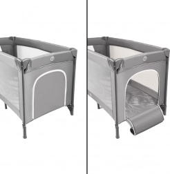 Fereastra laterală cu fermoar ușurează accesul părinților și le permite copiilor să iasă independent. În interior se află o saltea fixată cu arici, care stabilizează baza și crește confortul somnului. După pliere, pătuțul devine foarte compact și încape în portbagajul mașinii; geanta inclusă cu mânere facilitează transportul și depozitarea.