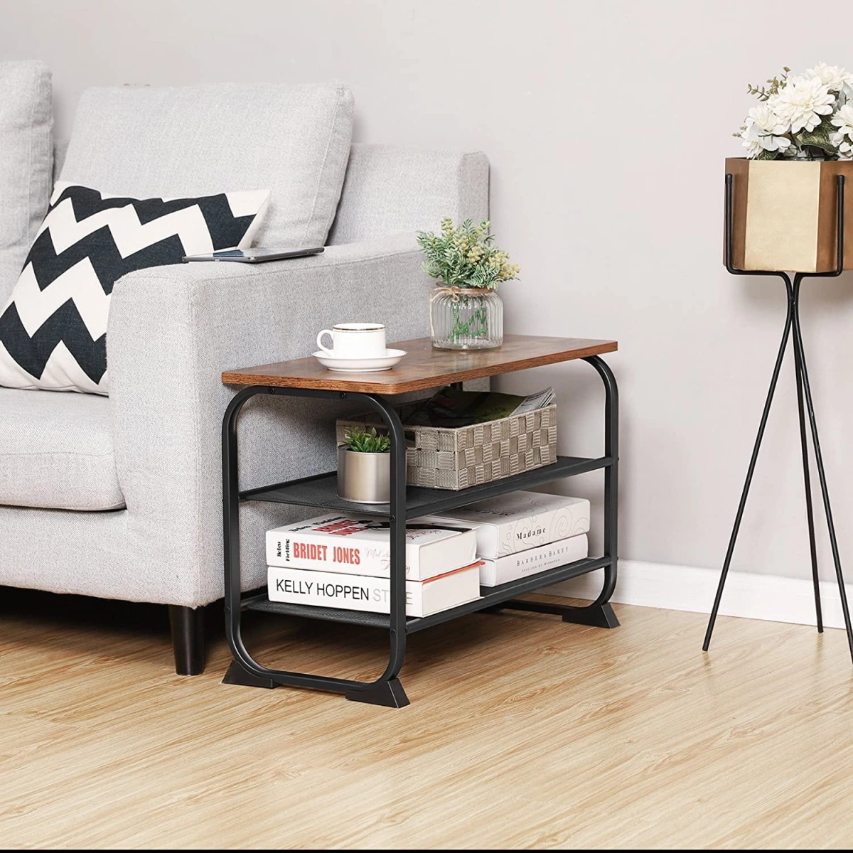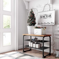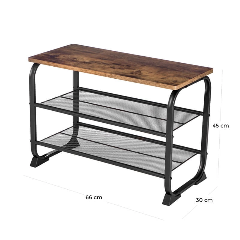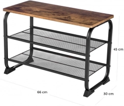 Acest dulap loft pentru pantofi cu bancă aduce ordine și stil în holul tău. Blatul rustic combinat cu metalul negru oferă un aspect industrial modern, ușor de asortat cu alte piese de mobilier. Suprafața de ședere integrată facilitează încălțarea și descălțarea și oferă, în același timp, un spațiu practic de depozitare.