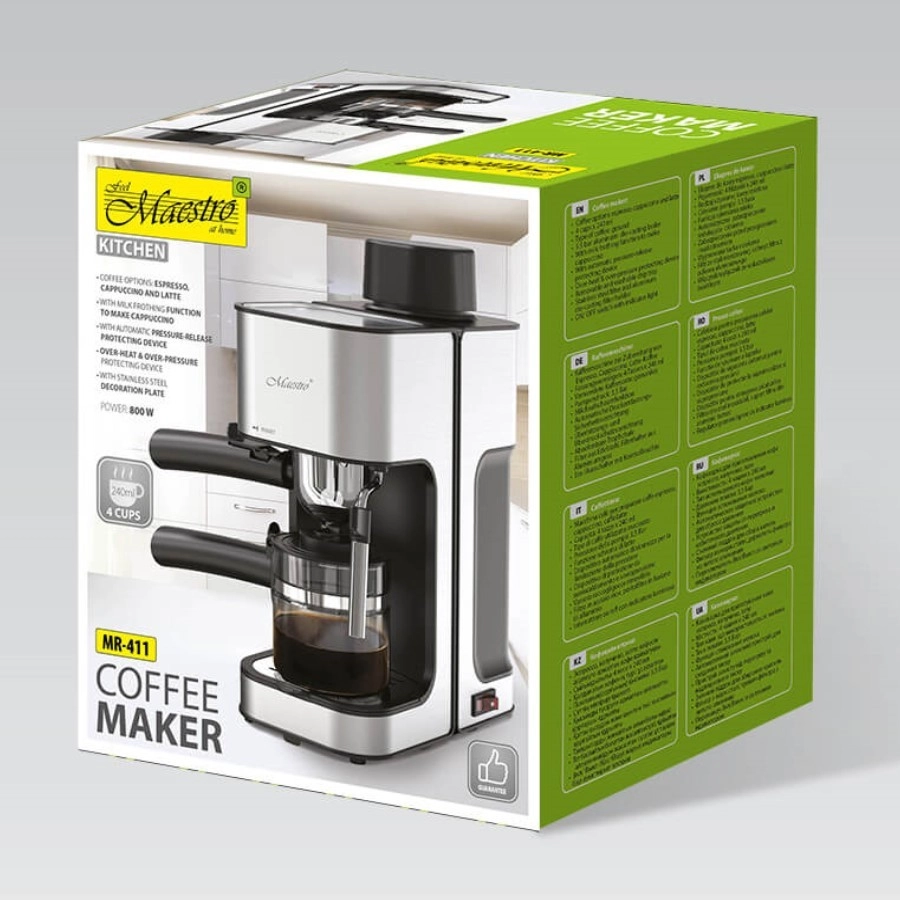 Espressorul cu portafiltru Maestro este alegerea ideală pentru toți iubitorii de cafea care doresc acasă espresso, cappuccino sau latte de calitate, fără operare complicată. Prepară cafeaua din cafea măcinată, astfel încât puteți alege exact blendul și intensitatea preferate. Datorită duzei de abur creați cu ușurință o spumă fină de lapte, iar suprafața încălzită pentru cești asigură că băutura rămâne fierbinte mai mult timp.