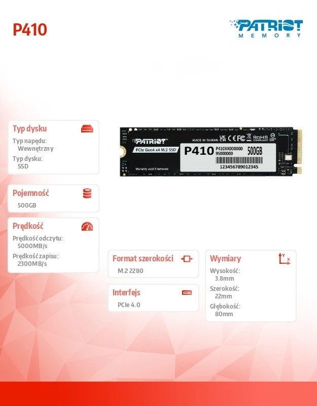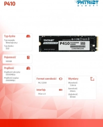Patriot P410 este un SSD NVMe PCIe 4.0 în format M.2 2280, conceput pentru răspuns rapid al sistemului și timpi mai scurți de încărcare pentru jocuri și programe. Datorită managementului termic îmbunătățit și stratului termic din grafen, își păstrează performanța stabilă chiar și în sarcini prelungite.