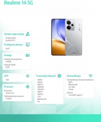 Smartphone-ul elegant Realme 14 5G în culoarea Mecha Silver oferă un ecran AMOLED de 6,67" de top, cu 120 Hz și luminozitate de până la 2000 niți, chipset puternic Snapdragon 6 Gen 4, o baterie mare de 6000 mAh și un sistem foto cu cameră principală de 50 Mpx cu OIS. Nu lipsesc 5G, Wi‑Fi 6, Bluetooth 5.2, Dual SIM și Android 15 cu Realme UI 6.0.