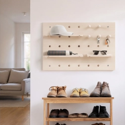 Organizatorul pegboard de perete MACLEAN, în finisaj lemn deschis, transformă un perete liber într-un spațiu de depozitare clar și elegant. Placa cu grilă regulată de orificii permite aranjarea liberă a diblurilor, cârligelor și rafturilor, astfel încât creezi cu ușurință loc pentru chei, ochelari, căști, articole de birou, decorațiuni sau unelte mici.