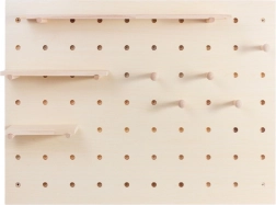 Tabla pegboard din lemn MACLEAN îmbină aspectul elegant al lemnului deschis cu funcționalitatea practică. Sistemul de orificii permite mutarea liberă a 3 polițe detașabile și a 5 cârlige/pini, astfel încât îți creezi cu ușurință propria configurație pentru obiectele de zi cu zi. Ideală pentru hol, birou, bucătărie și atelier.