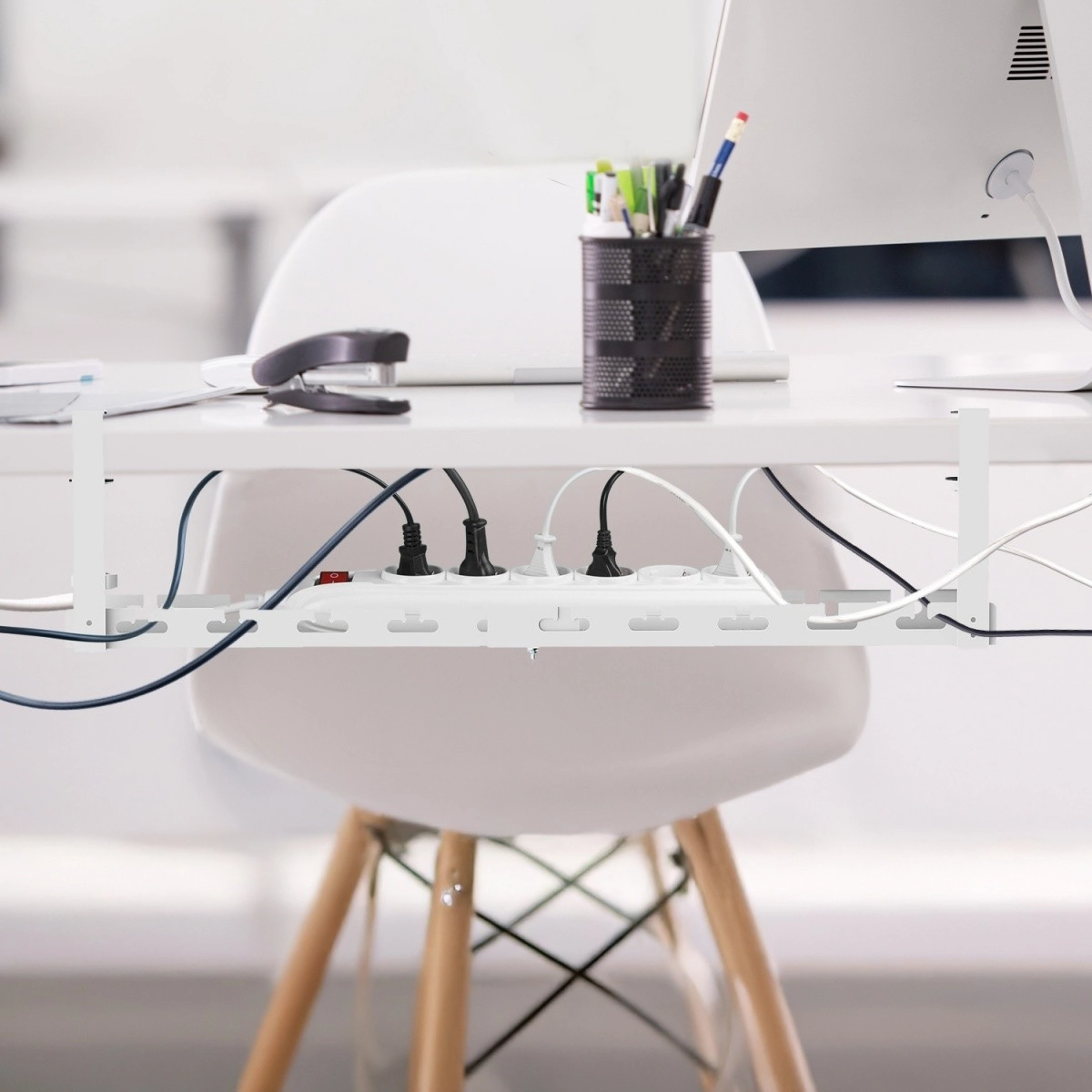 Montajul durează doar câteva clipe: suporturile cu clemă se fixează ferm de blat fără găurire, iar la nevoie organizatorul poate fi mutat rapid. Datorită lungimii reglabile 433–728 mm, se adaptează la diverse dimensiuni de birouri și plinte. Eleganta culoare albă îmbunătățește estetica spațiului de lucru și crește siguranța, ținând cablurile departe de podea.