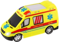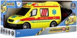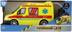 Ambulanța galbenă, cu marcaje AMBULANCE și lumină funcțională, încurajează jocul creativ al micilor salvatori.