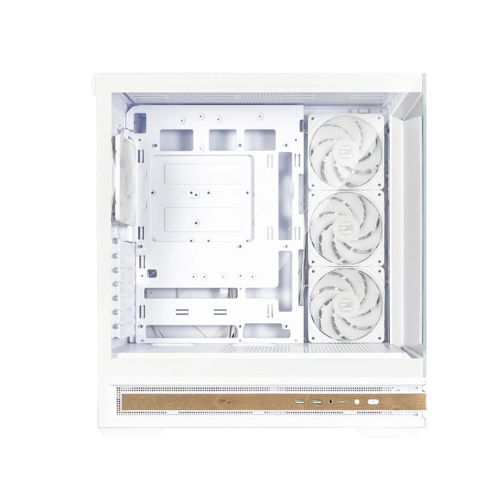 Carcasa este proiectată pentru răcire de top: admisie laterală a aerului, poziții optimizate ale ventilatoarelor și pale aerodinamice AF120 care reduc vibrațiile și zgomotul curentului de aer, maximizând în același timp fluxul. Datorită celor 34 mm spațiu pentru gestionarea cablurilor, traseelor gândite inteligent și panoului lateral ușor detașabil, asamblarea și întreținerea sunt rapide și clare.