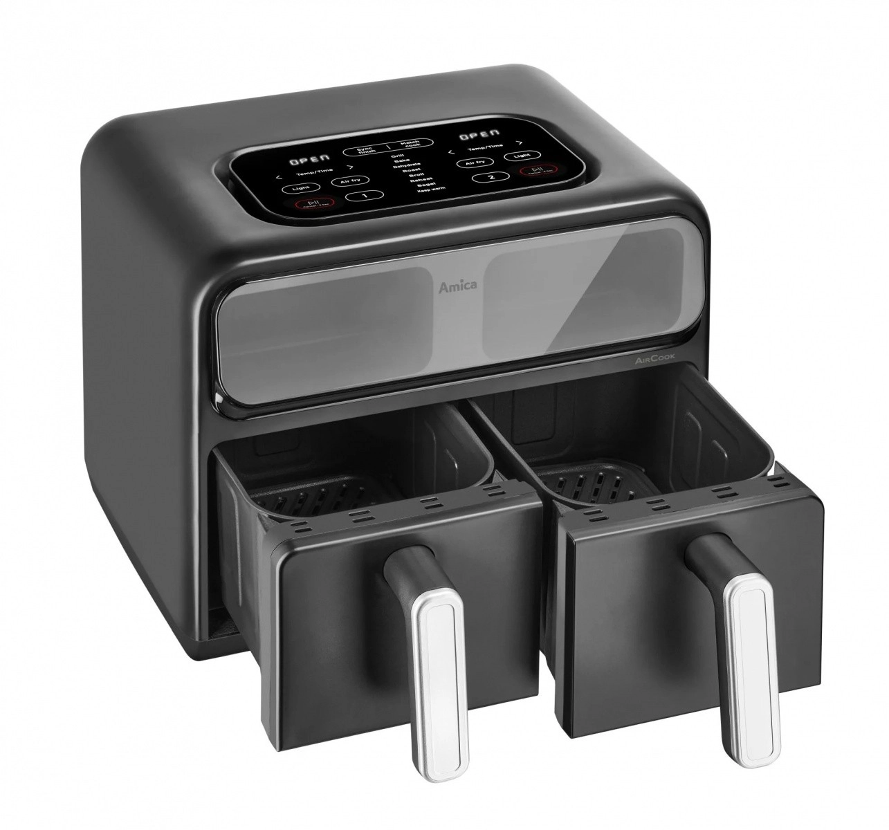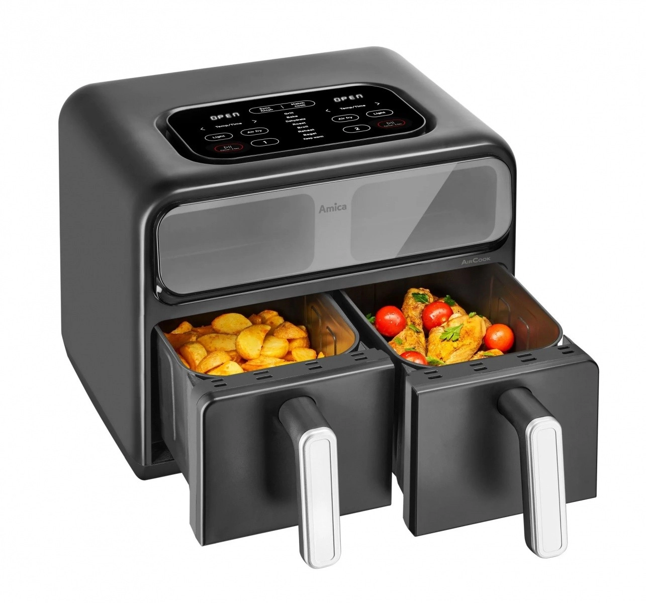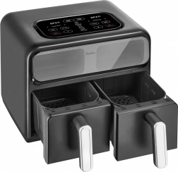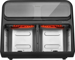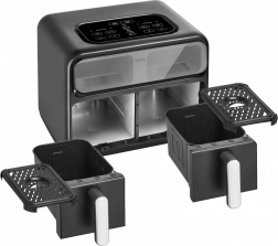 Descoperiți un mod de gătit mai rapid și mai sănătos. Friteuza cu aer cald cu două camere prepară felurile preferate cu minimum de grăsime datorită circulației intense a aerului fierbinte. Cele două zone independente permit coacerea și prăjirea simultană a ingredientelor diferite, iar datorită ferestrelor aveți mereu control asupra procesului fără a deschide inutil sertarele.