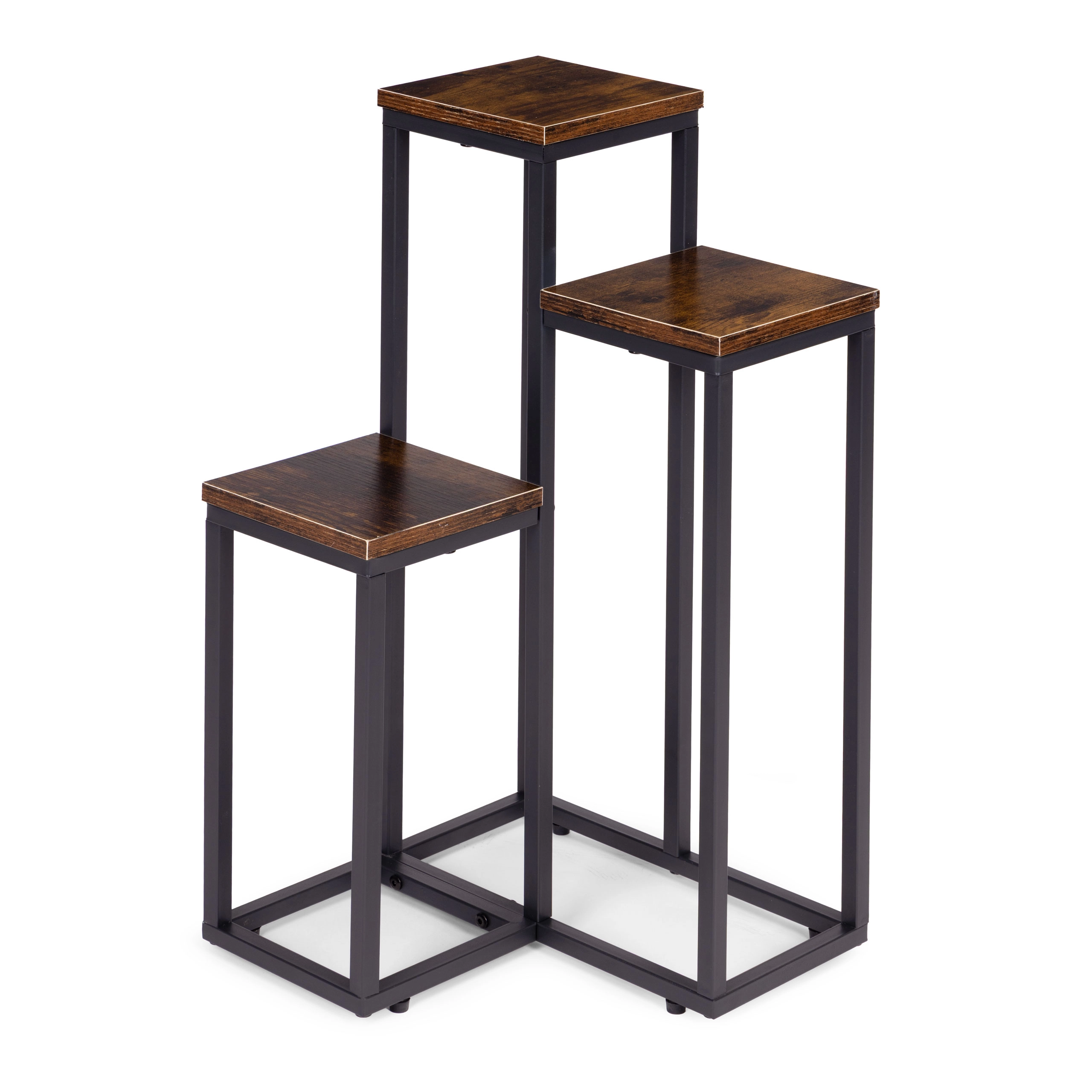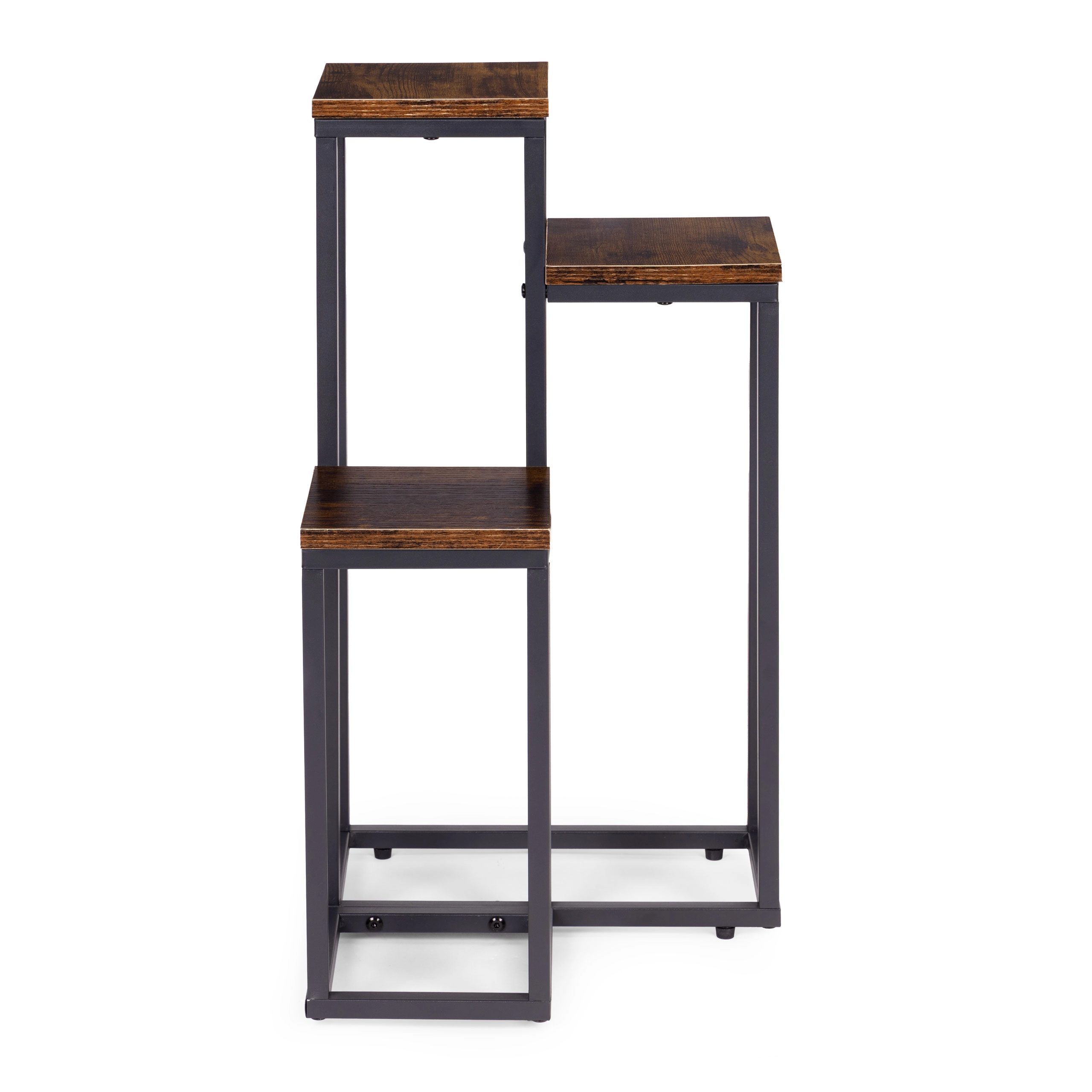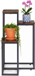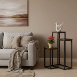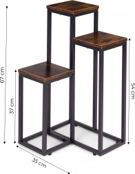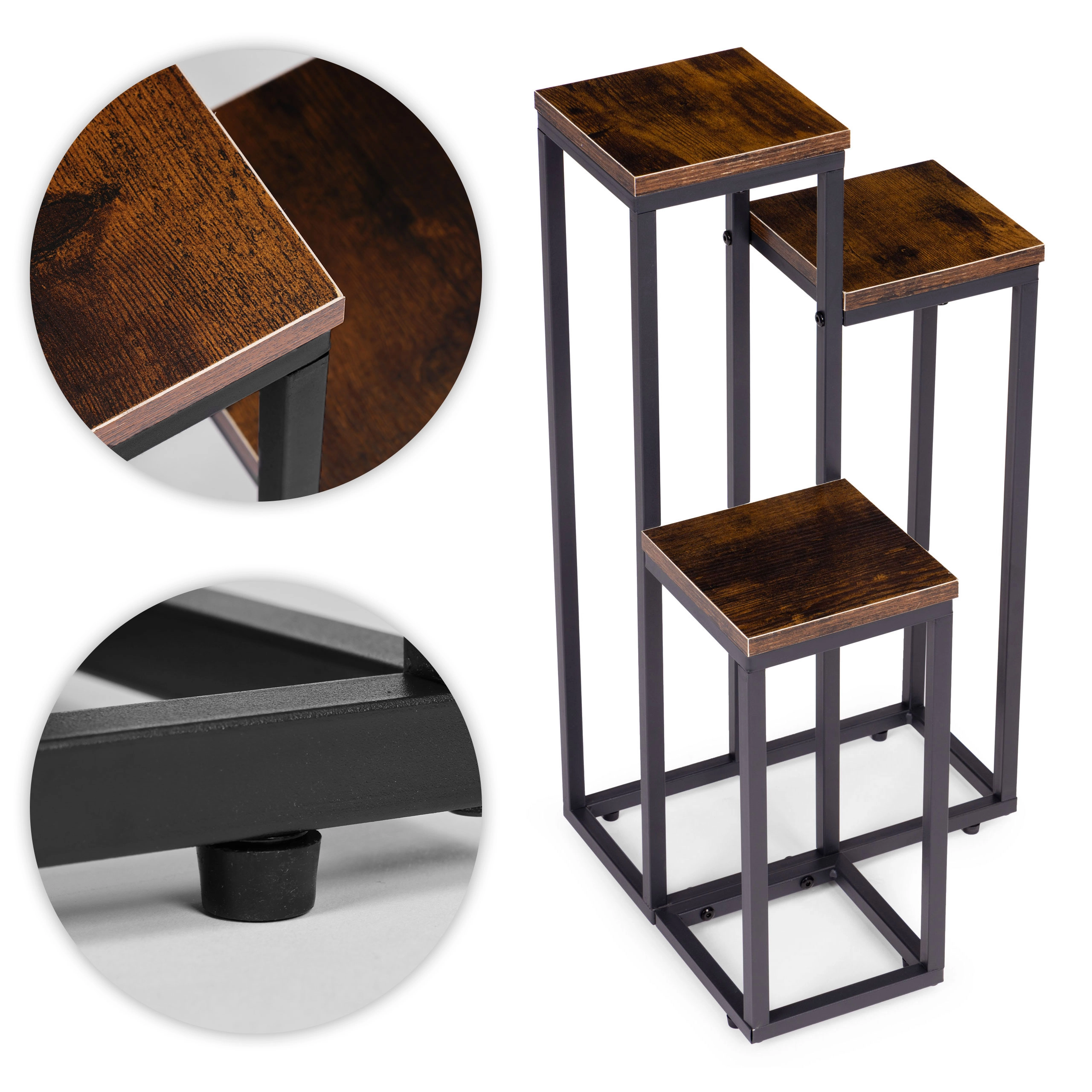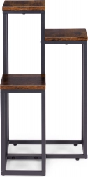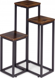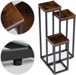 Rama din oțel vopsit în câmp electrostatic rezistă la coroziune și uzură mecanică, în timp ce plăcile cu decor de lemn natural accentuează caracterul loft modern. Picioarele antiderapante sporesc stabilitatea și protejează pardoseala împotriva zgârieturilor. Sarcina maximă de 5 kg este ideală pentru majoritatea ghivecelor și decorațiunilor.