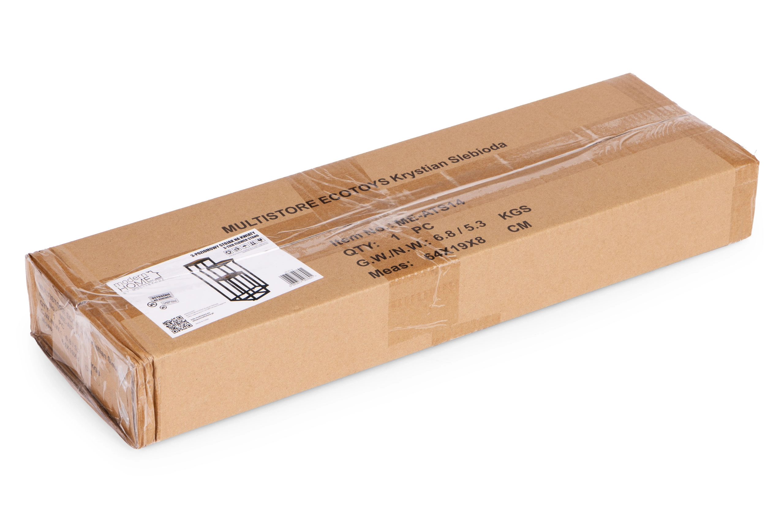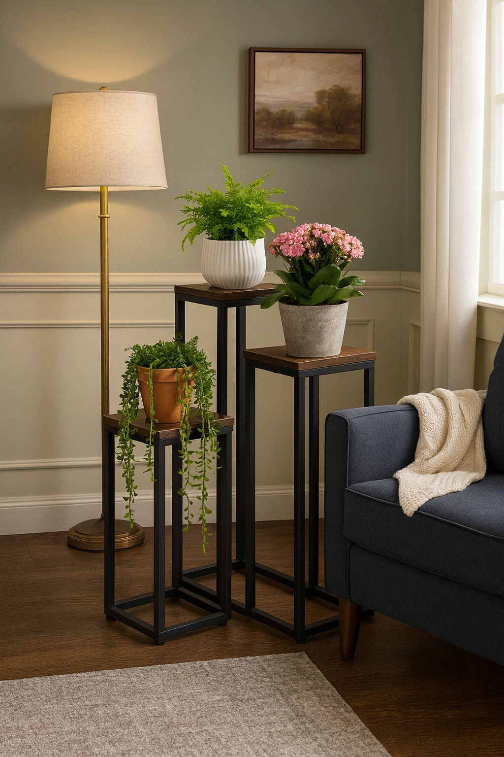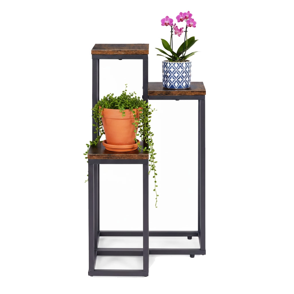 Rama din oțel vopsit în câmp electrostatic rezistă la coroziune și uzură mecanică, în timp ce plăcile cu decor de lemn natural accentuează caracterul loft modern. Picioarele antiderapante sporesc stabilitatea și protejează pardoseala împotriva zgârieturilor. Sarcina maximă de 5 kg este ideală pentru majoritatea ghivecelor și decorațiunilor.