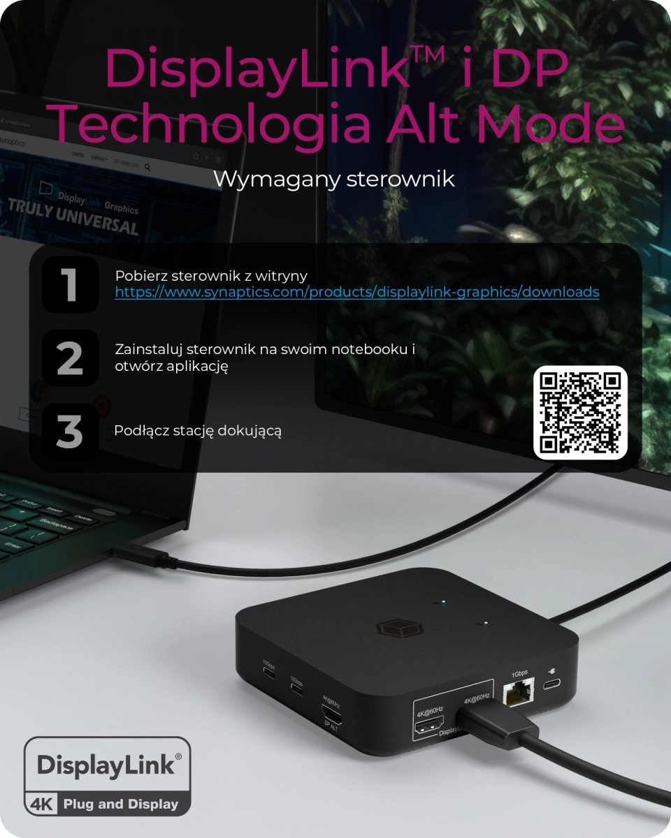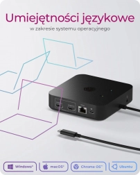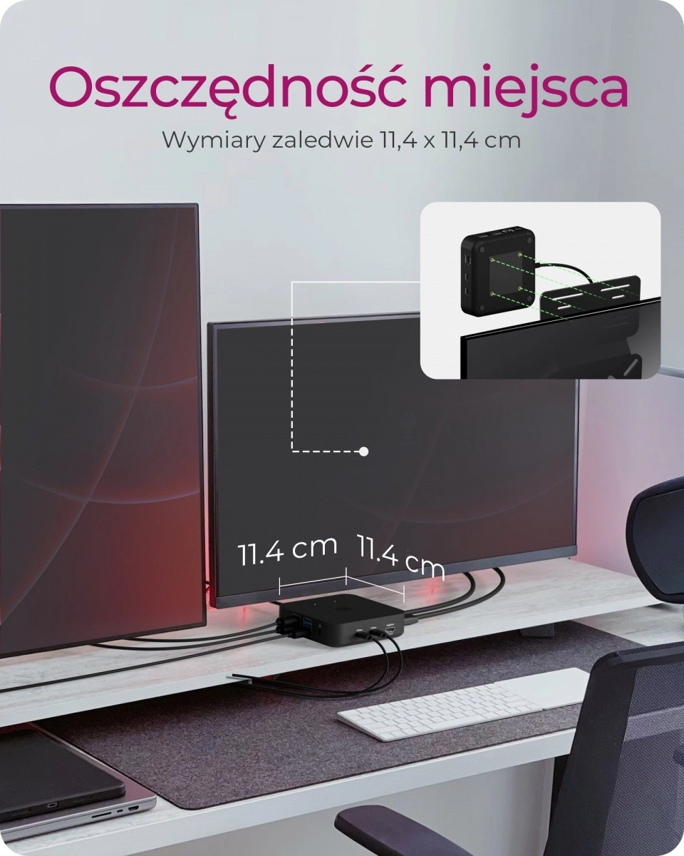 Carcasa compactă, cu dimensiuni de 11,4 × 11,4 cm, economisește spațiu pe birou și poate fi montată în spatele monitorului cu ajutorul unui suport VESA 50×50 mm (neinclus în pachet). Datorită tehnologiei DisplayLink și modului DP Alt Mode obții o extindere flexibilă a imaginii chiar și pe sisteme care nu suportă nativ mai multe ecrane externe.