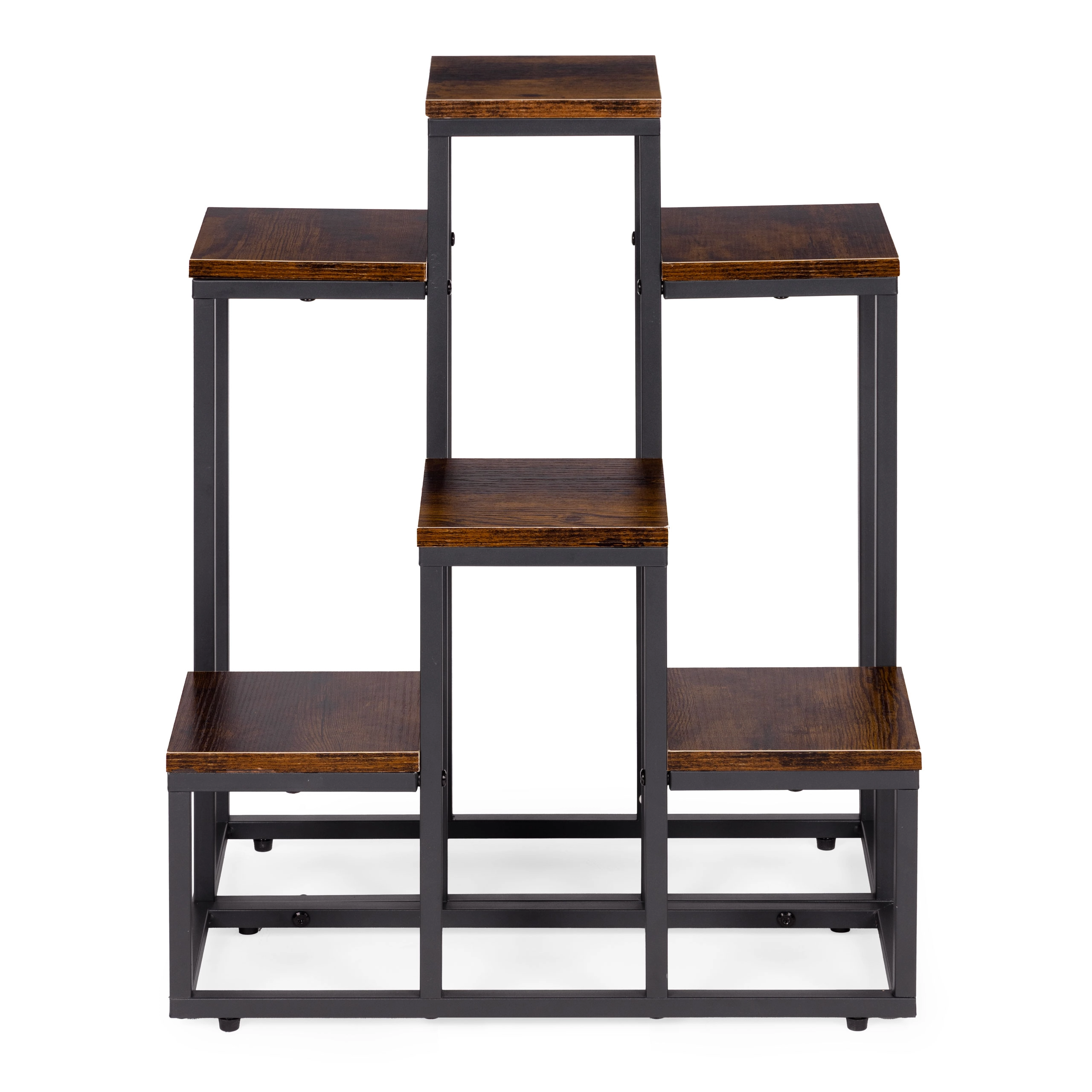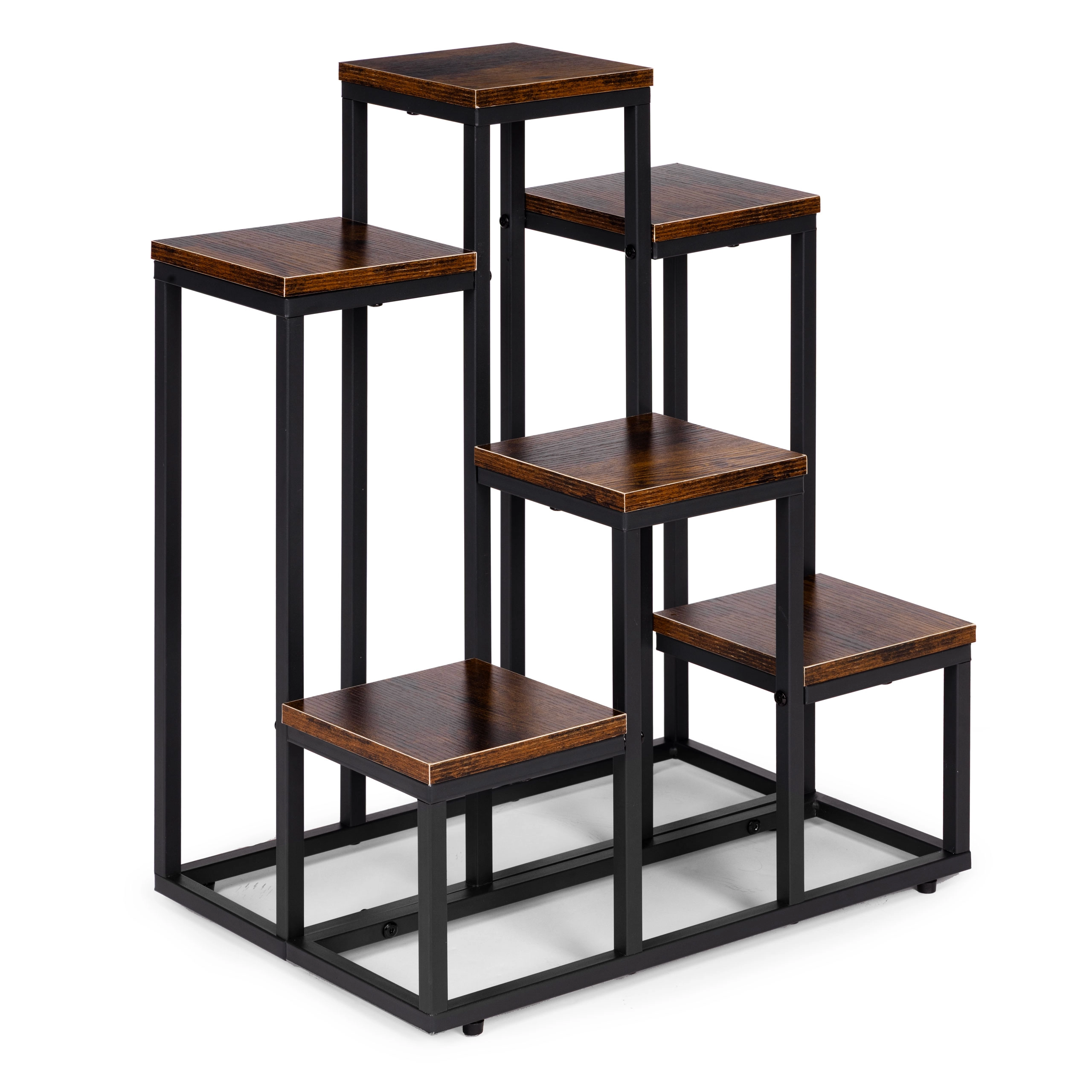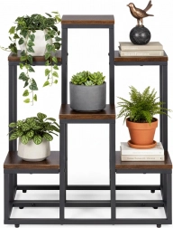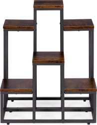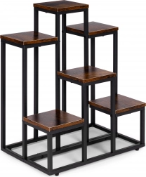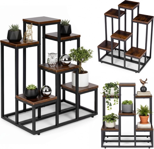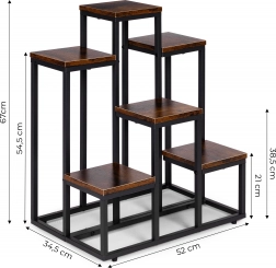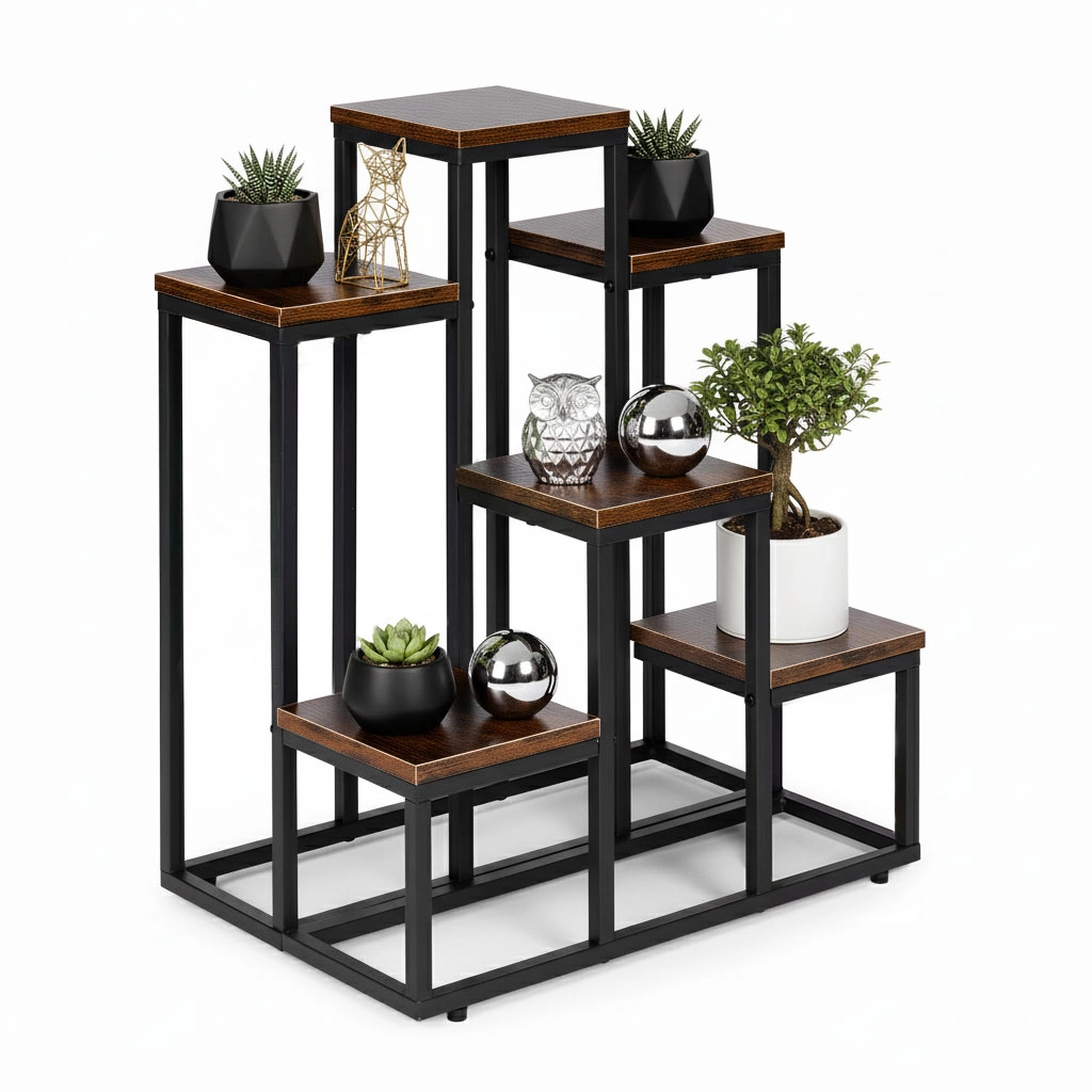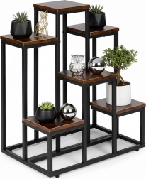 Acest suport pentru flori pe mai multe niveluri combină designul industrial modern cu funcționalitatea. Șase rafturi pătrate cu decor de lemn creează o compoziție atrăgătoare pentru ierburi, suculente și plante curgătoare, în timp ce cadrul negru din oțel asigură stabilitate și durabilitate. Datorită dimensiunilor compacte, folosește cu ușurință spațiul vertical lângă perete sau în colțul camerei.