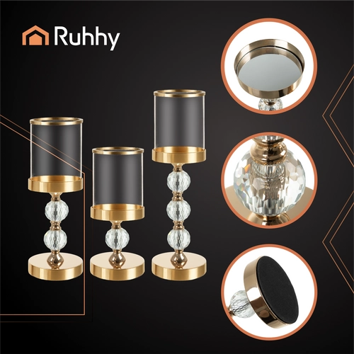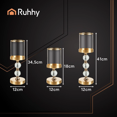 Creează acasă o atmosferă primitoare cu setul de sfeșnice RUHHY. Cele trei înălțimi diferite oferă un efect armonios și adaugă profunzime spațiului. Elementele oglindă și accentele cristaline subliniază stilul glamour elegant, în timp ce finisajul auriu conferă interiorului un strălucir rafinat. Setul este universal – se potrivește perfect în living, dormitor, sufragerie sau baie.