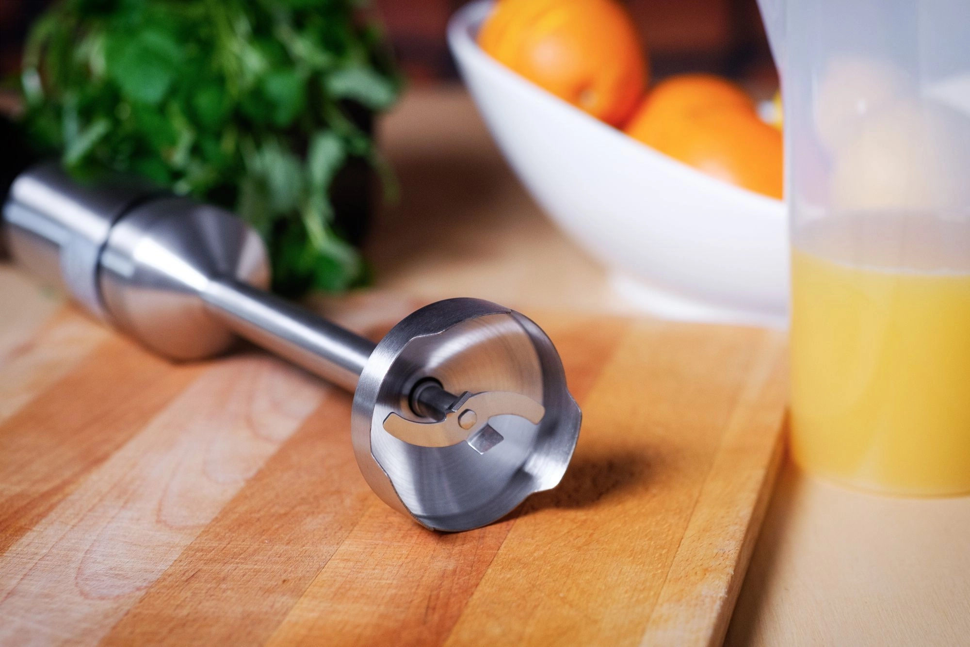 Piciorul de mixare metalic, rezistent, și lamele din inox dispuse pe două niveluri garantează rezultate fine și durabilitate îndelungată, chiar și la utilizare frecventă.