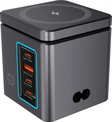 Combinația practică 3× USB‑C, 1× USB‑A și două suprafețe wireless (15 W pentru telefon, 5 W pentru căști) permite încărcare flexibilă fără compromisuri. Suportul pentru protocoalele Power Delivery și Quick Charge aduce alimentare fulgerătoare – de exemplu, Samsung Galaxy S22 până la 60% în 30 de minute.