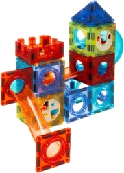 Blocurile magnetice și elementele de pistă din plastic ABS rezistent se prind ușor și stabil datorită magneților puternici. Copiii pot construi structuri plane și spațiale, turnuri, poduri și mai ales piste creative pentru bile cu tuneluri, curbe și cupe. Culorile transparente sprijină percepția formelor și culorilor și invită la explorare.