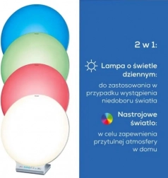 Datorită funcției Moodlight îți creezi o atmosferă plăcută cu iluminare ambientală colorată. În aplicația mobilă poți alege dintre 10 scene prestabilite, poți ajusta luminozitatea și temporizatorul sau poți seta manual și fixa o culoare din 256 de nuanțe. Practicul temporizator LED oferă cinci durate de terapie și oprește automat lampa la expirarea timpului setat.