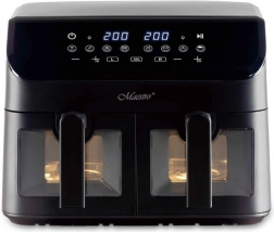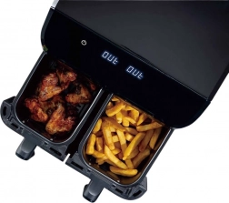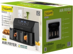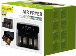 MAESTRO MR-758 combină circulația rapidă a aerului fierbinte cu coșuri duble spațioase de 2×4,5 l, astfel încât poți pregăti simultan, de exemplu, cartofi prăjiți și pui – fiecare în zonă independentă cu propriile setări de timp și temperatură. Datorită suprafeței cu tratament antiaderent, curățarea este ușoară, iar utilizarea zilnică, confortabilă.