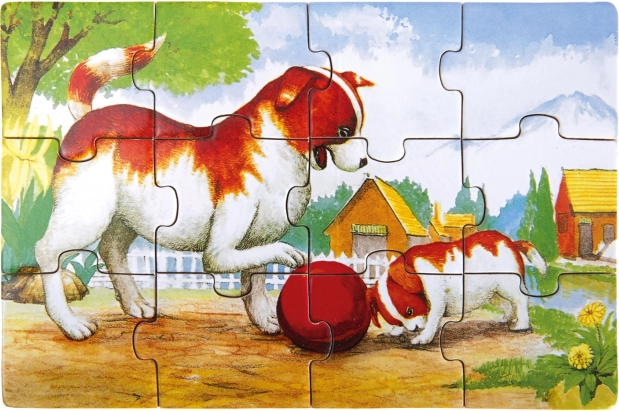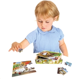 Descoperiți farmecul puzzle-urilor tradiționale din lemn, care prezintă motifuri precum pisica, câinele, caii și iepurașii. Setul include 48 de piese, ambalate într-o cutie practică cu capac, facilitând depozitarea și transportul lor.
