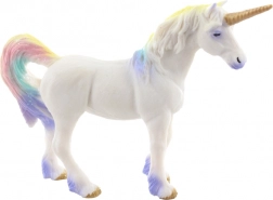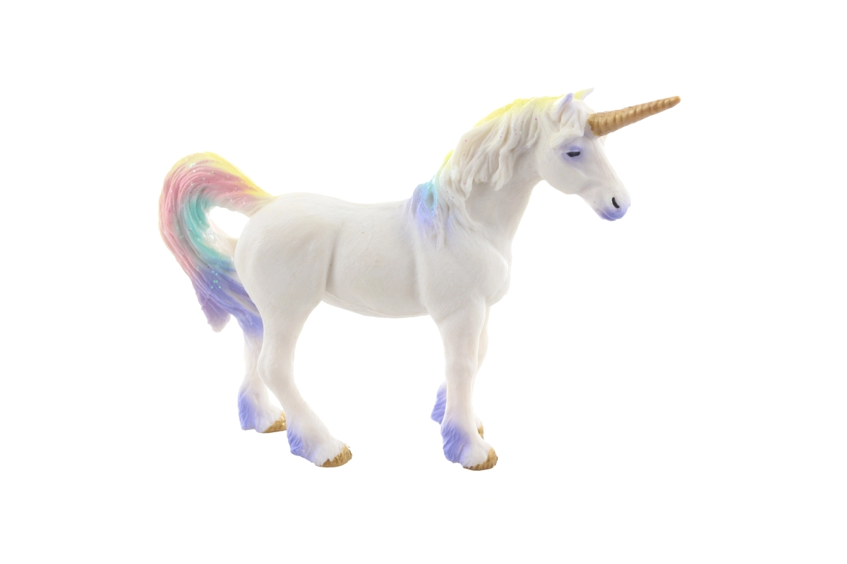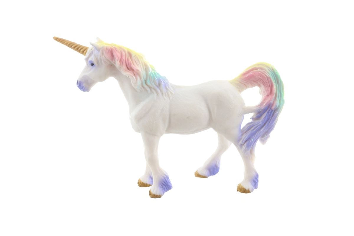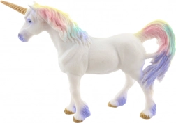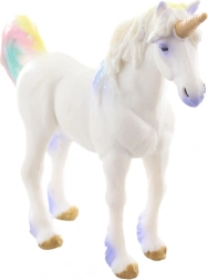 Acest unicorn elegant, în variantă albă, cu corn auriu și coamă pastel curcubeu, cucerește prin modelarea realistă și accentele cromatice delicate. Se potrivește de minune pentru jocuri imaginative, povestiri și ca decor pentru camera copilului.