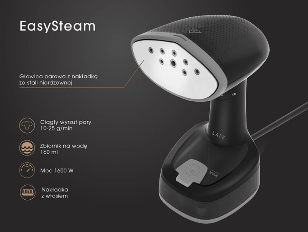 Lafe EasySteam este o alternativă practică la fierul de călcat pentru netezirea rapidă și delicată a hainelor. Datorită puterii de 1600 W și debitului stabil de abur de 15–25 g/min, face față cutelor zilnice fără a deteriora materialele fine. Placa din inox distribuie aburul uniform pentru un rezultat eficient.