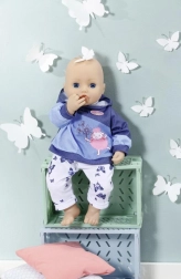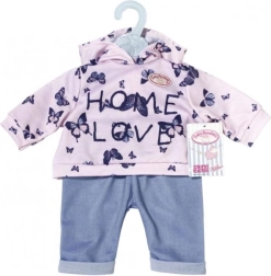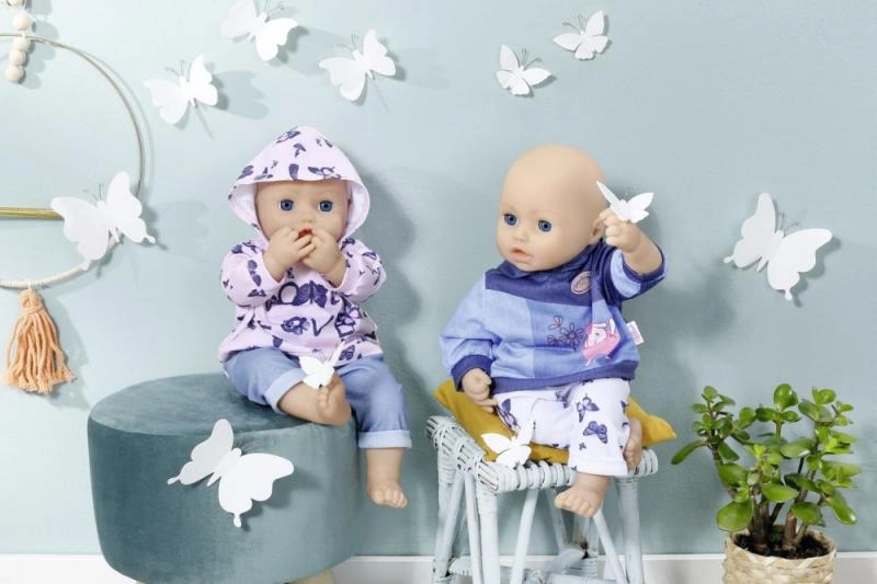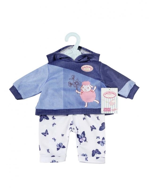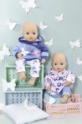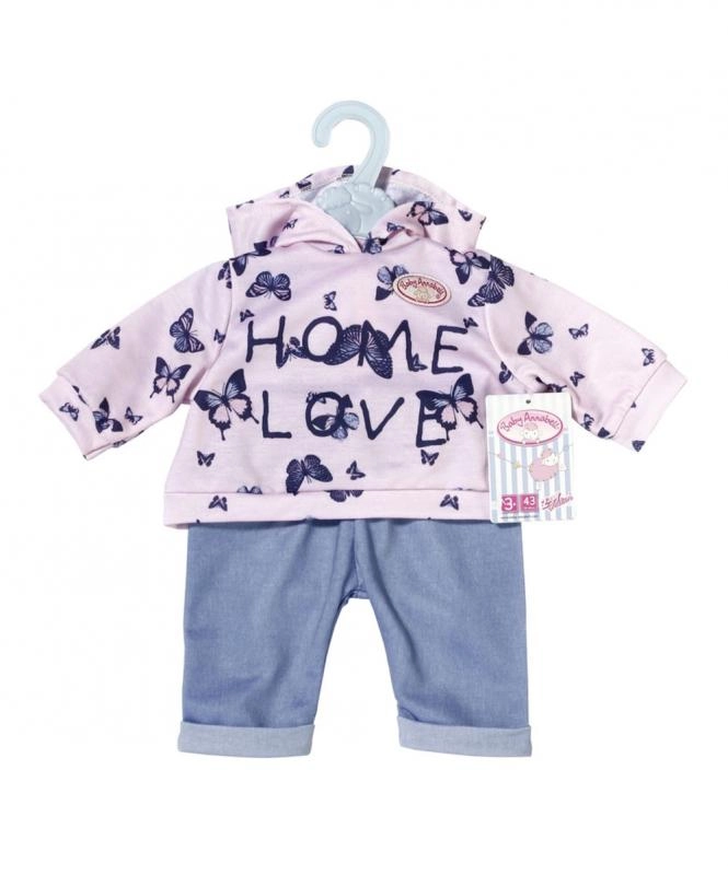 Răsfață-ți păpușa BABY ANNABELL cu o ținută de casă confortabilă. Setul oferă două stiluri diferite: hanorac roz cu glugă cu fluturași delicați și pantaloni în stil denim, sau hanorac albastru cu glugă cu imprimeu drăgălaș și pantaloni sport confortabili. Materialele sunt moi și plăcute la atingere, ideale pentru joaca zilnică.