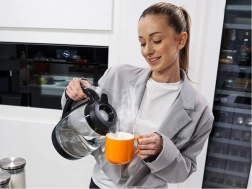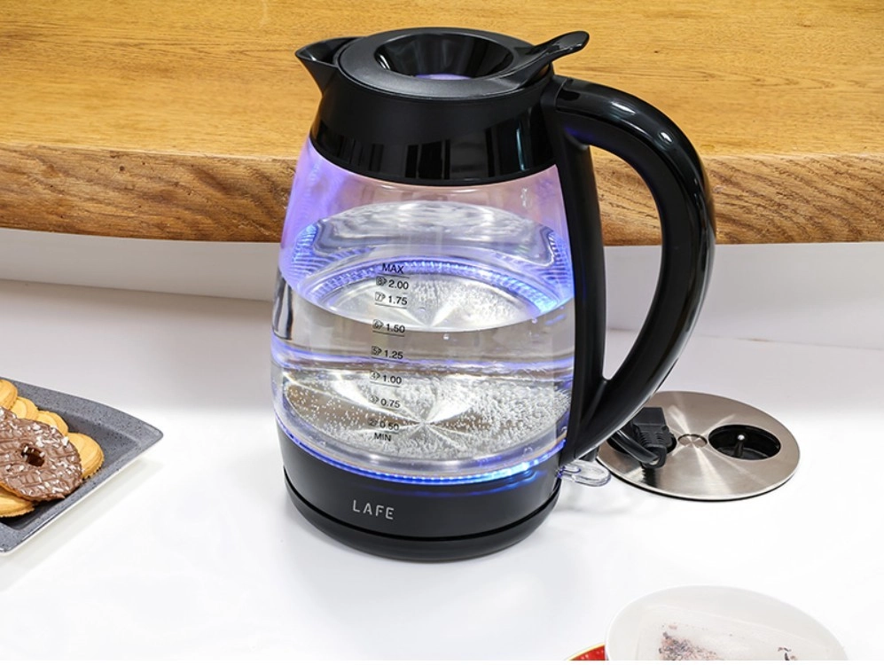 Sticla rezistentă permite controlul nivelului apei, iar lumina LED albastră indică elegant încălzirea și oferă bucătăriei un aspect modern.