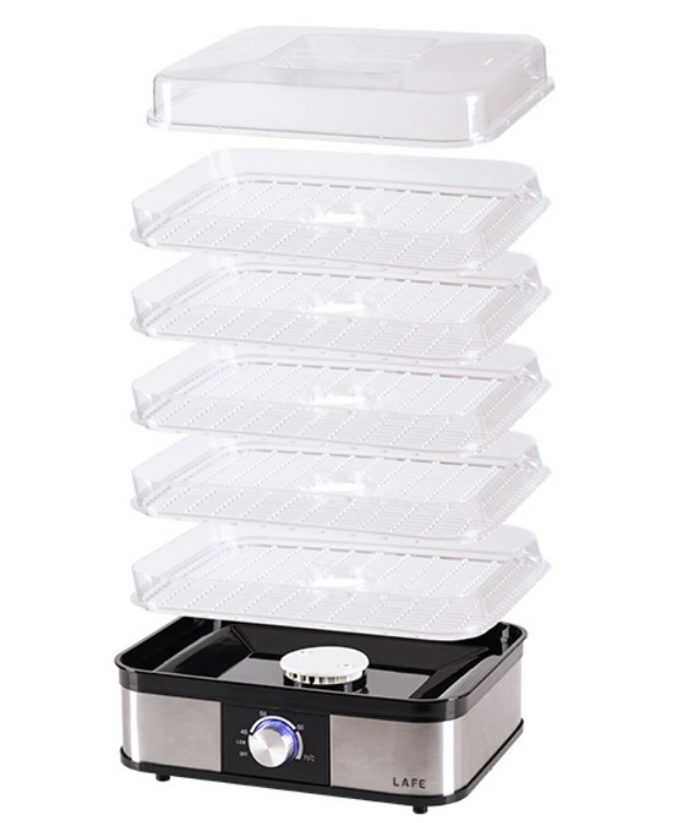 Nivelurile transparente facilitează controlul procesului, în timp ce cele 5 tăvi încăpătoare permit uscarea unei cantități mai mari de ingrediente simultan. Dacă trebuie să economisiți spațiu, puteți îndepărta simplu unele tăvi. Ventilatorul integrat și tăvile perforate susțin circulația, previn apariția mucegaiului și reduc timpul de uscare.