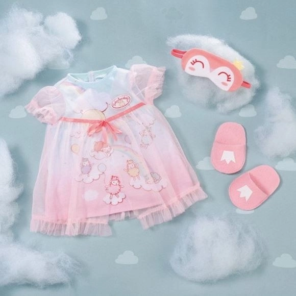 Cu această cămășuță de noapte, Baby Annabell se simte ca pe un nor. Datorită fustiței superioare din tulle și motivelor vesele de oițe, păpușa ta va adormi cu plăcere în fiecare noapte. Ritualul de noapte este însoțit și de o mască drăgălașă de dormit și papucei, care pot fi scoși ușor.