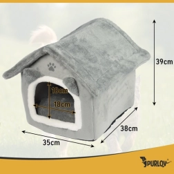 Căsuța Purlov este o ascunzătoare ideală și un loc comod pentru relaxare. Pisica se poate ascunde în interior pentru un somn liniștit sau se poate așeza deasupra. Materialul pluşat oferă căldură și confort pe tot parcursul anului, în timp ce construcția ușoară asigură o respirabilitate plăcută în lunile mai calde.