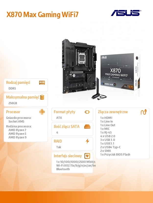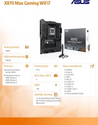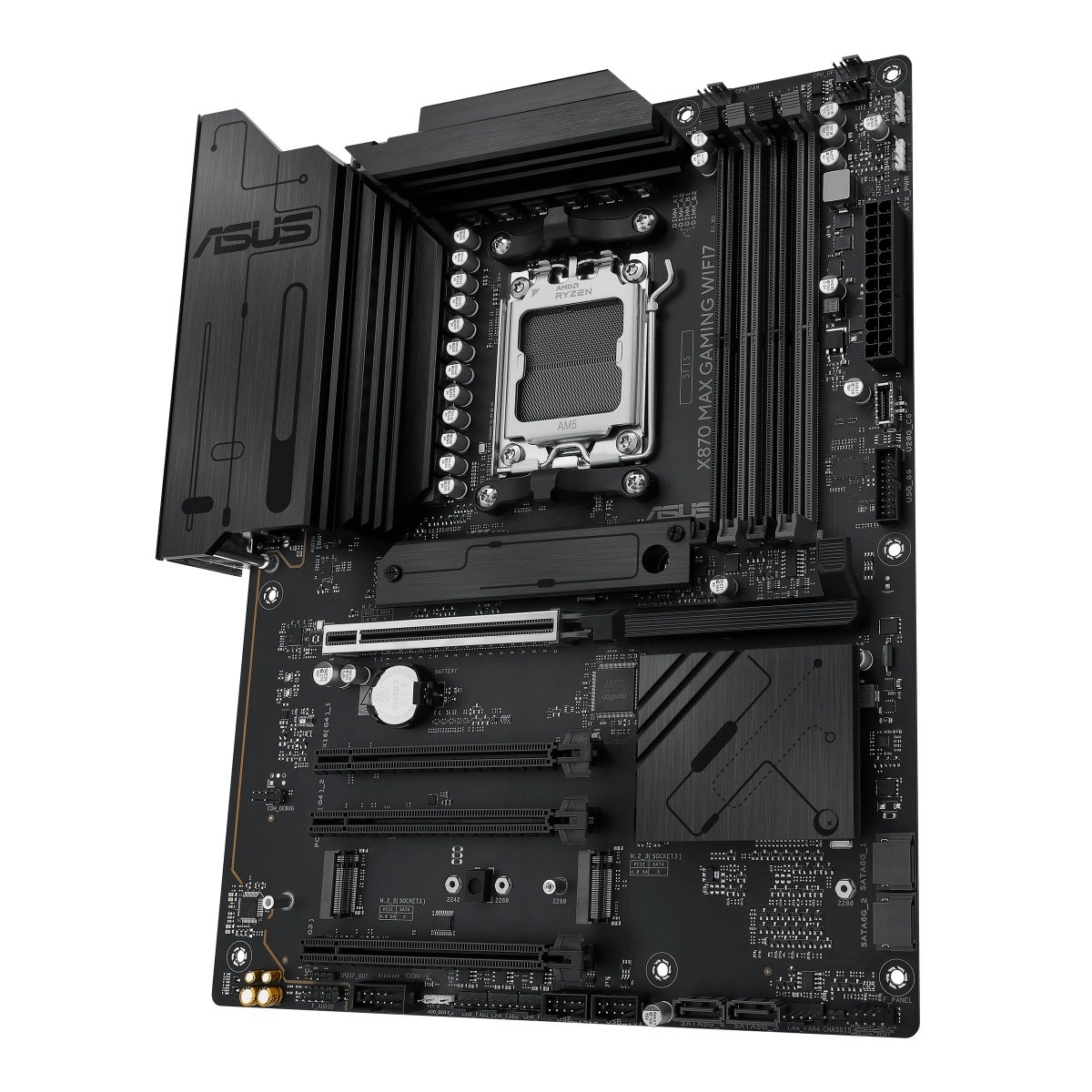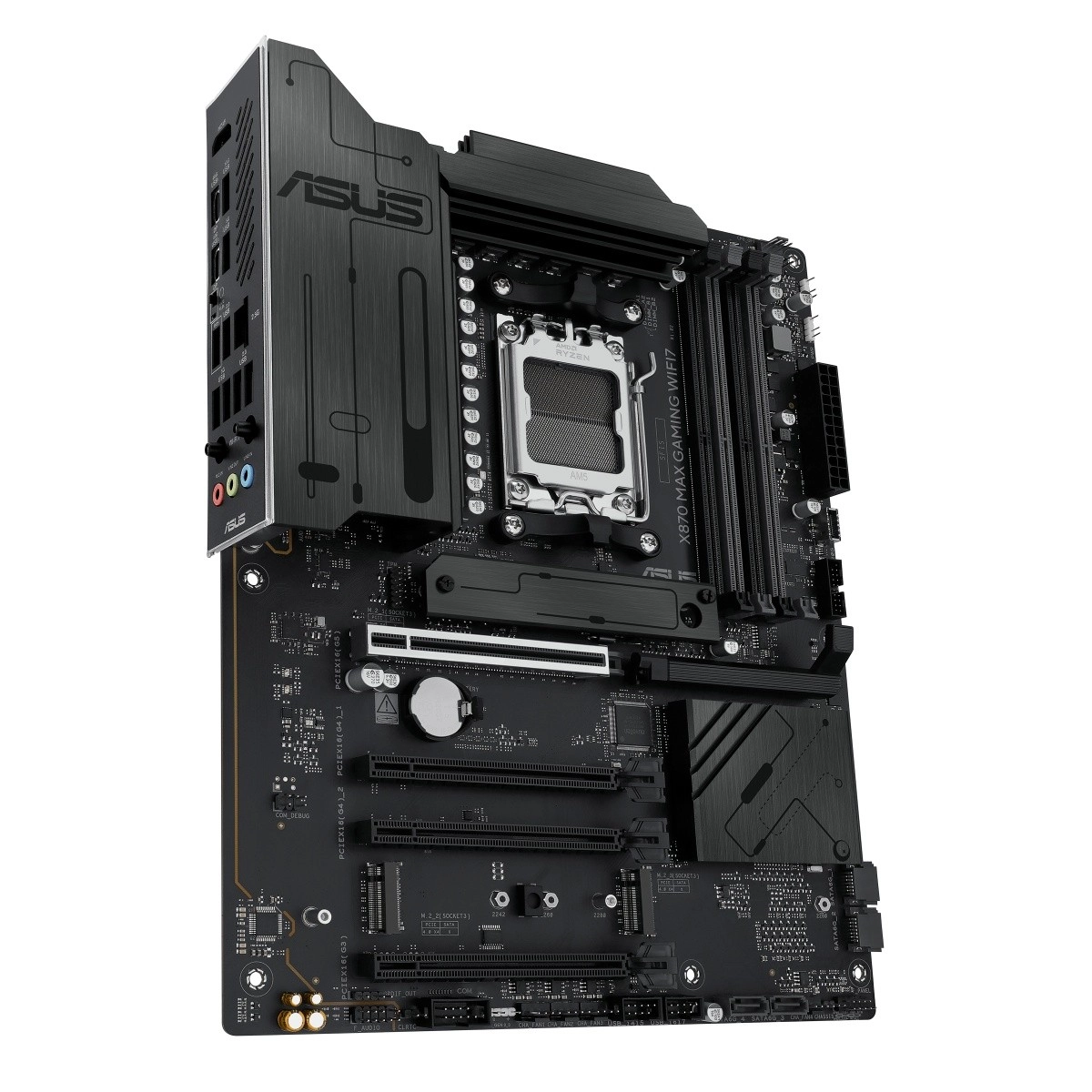 ASUS X870 Max Gaming WiFi 7 este o placă de bază de top pentru gaming pe platforma AM5, care deblochează performanța maximă a procesoarelor AMD Ryzen seria 9000. Combină un etaj de alimentare stabil, radiatoare masive pentru VRM și M.2 cu conectivitate modernă, inclusiv Wi‑Fi 7 și USB‑C, pentru a oferi viteză, stabilitate și lățime de bandă pentru jocuri, creație de conținut și fluxuri de lucru bazate pe AI.