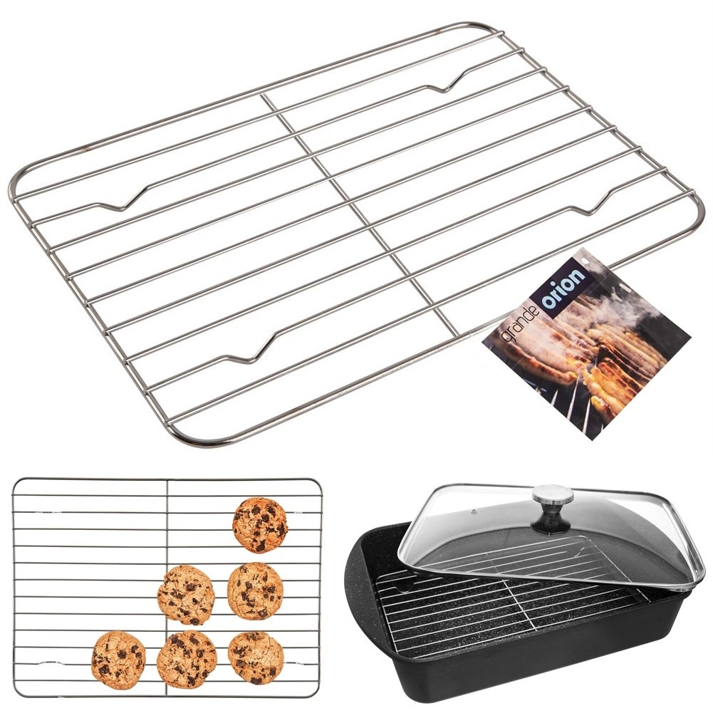 Grătar practic pentru tavă de copt, care ridică preparatele deasupra fundului, astfel încât carnea nu stă în grăsime și aerul fierbinte poate circula uniform. Grilajul deschis asigură, de asemenea, răcirea rapidă și uniformă a blaturilor coapte, biscuiților sau brioșelor.