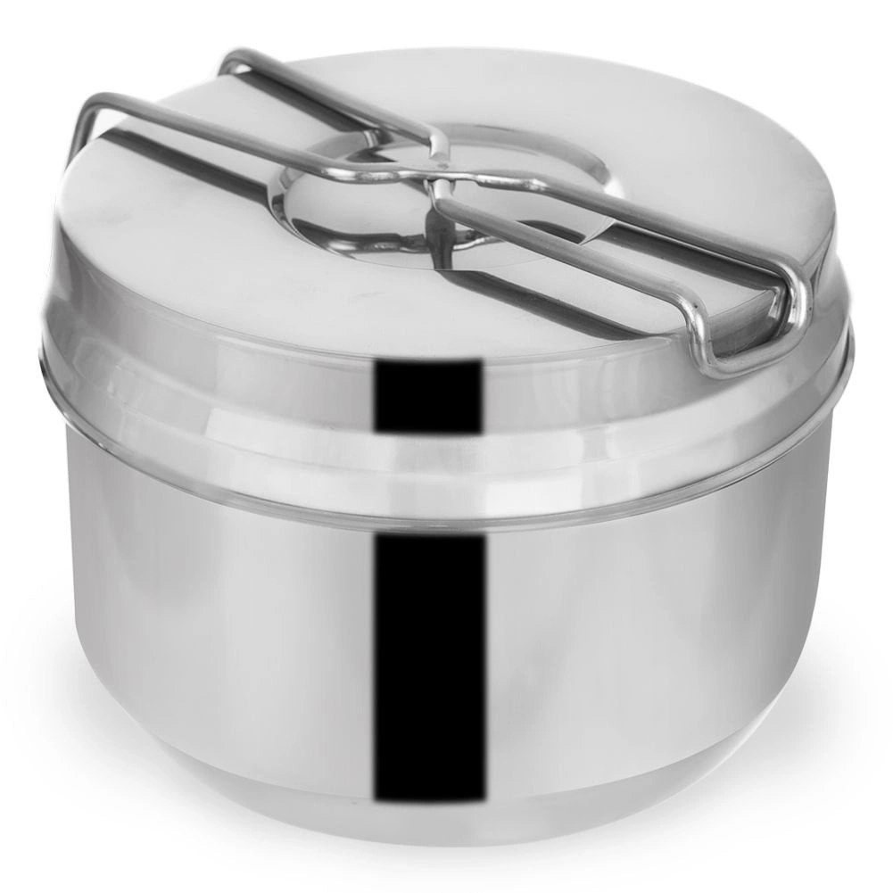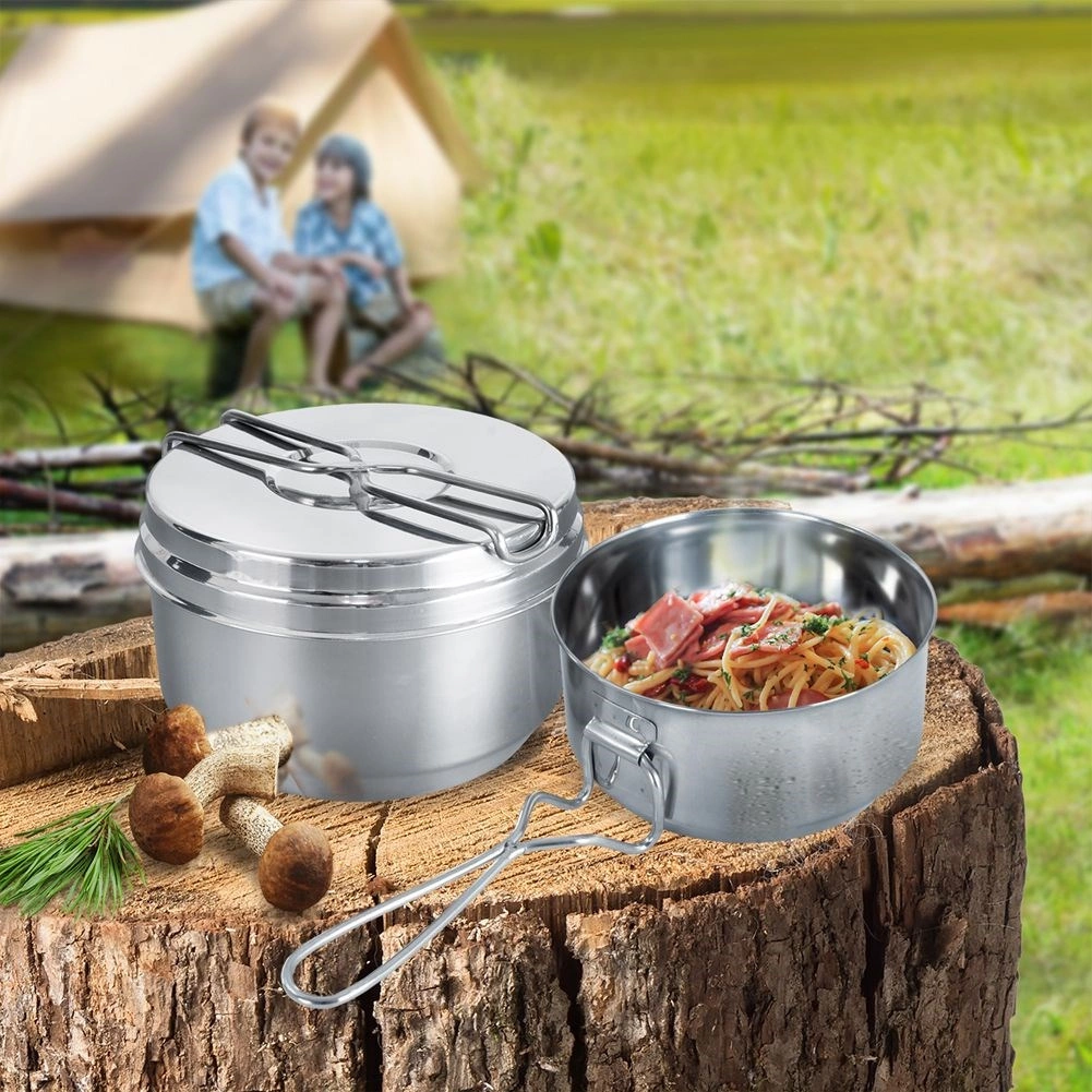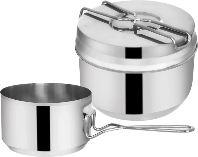 Această gamelă de camping din inox, în 3 piese, oferă tot ce este necesar pentru servirea mesei în deplasare. După despachetare, obții două crăticioare mici și un capac / farfurie pentru porționare și servire comode. Datorită mânerelor rabatabile, întregul set încape ușor în rucsac și este gata pentru orice aventură.