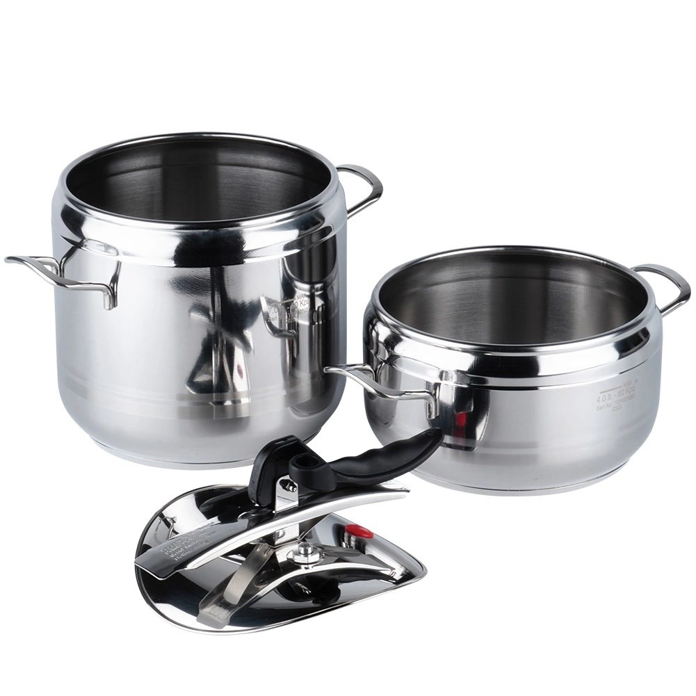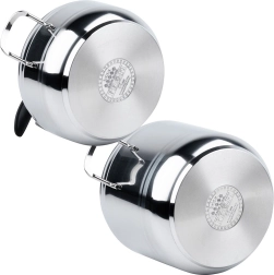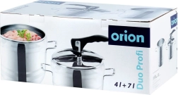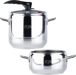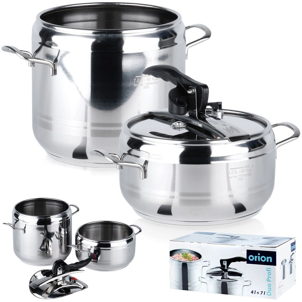 Set practic de două oale sub presiune din oțel inoxidabil, cu volume de 4 și 7 litri și un singur capac universal pentru gătit rapid și economic. Datorită gătitului sub presiune, preparatele sunt gata mult mai repede, cu un consum mai mic de energie și cu păstrarea gustului și a nutrienților. Setul este compatibil cu plite pe gaz, electrice, vitroceramice, cu halogen și cu inducție și oferă utilizare sigură datorită 2 supapelor de siguranță și posibilității de reglare a presiunii. Oțelul inoxidabil de calitate și fundul akutermic în 3 straturi asigură încălzire uniformă și durată de viață îndelungată.