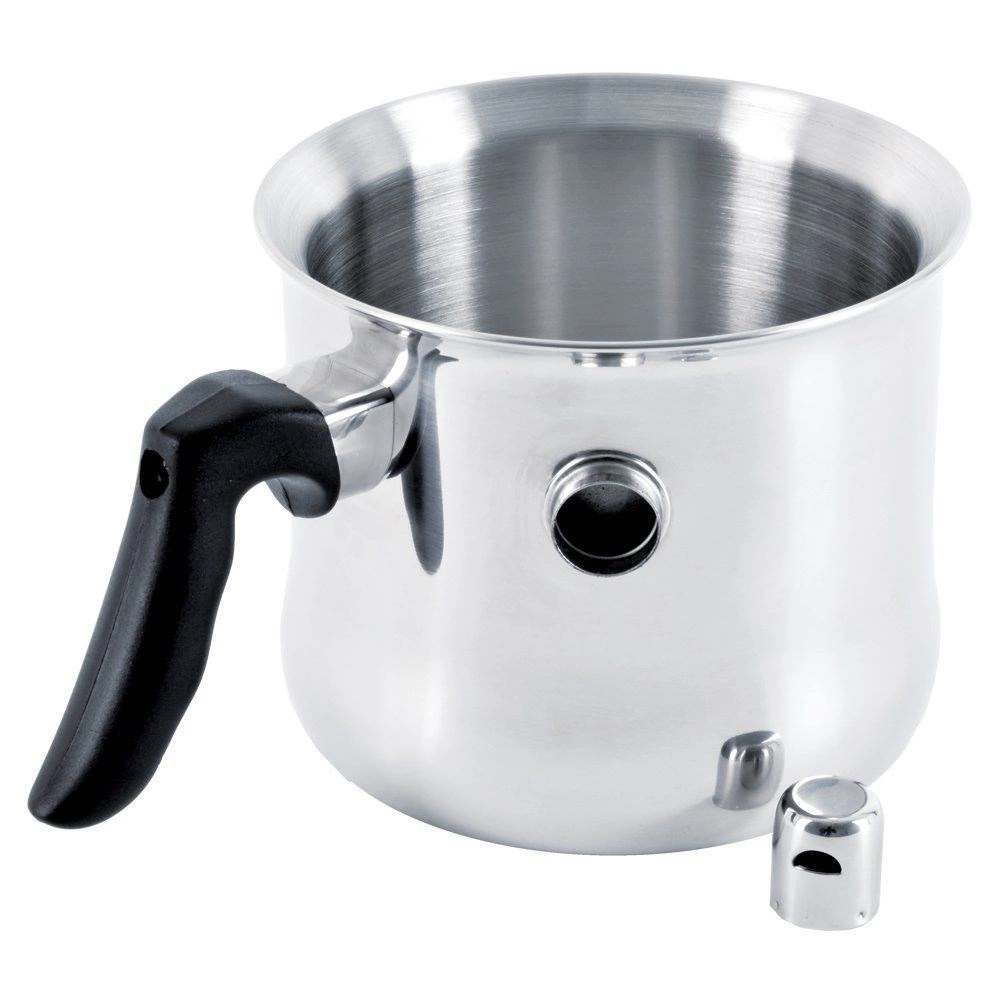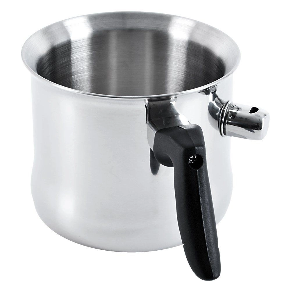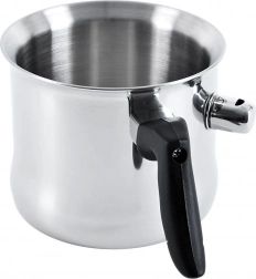 Această oală pentru lapte, cu perete dublu și cămașă de apă, este o alegere excelentă pentru încălzirea delicată a laptelui, ciocolatei, budincilor sau sosurilor fine. Este suficient să desfiletați supapa fluierătoare, să turnați apă în cămașă și să gătiți – când laptele este gata, supapa va fluiera. Mânerul ergonomic, de culoare neagră, este plăcut la atingere și asigură o manipulare în siguranță.