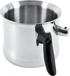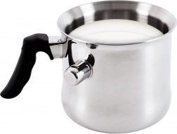 Această oală din inox de calitate, cu perete dublu și manta de apă, este ideală pentru încălzirea și fierberea delicată a laptelui, prepararea de sosuri, budinci și topirea ciocolatei. La atingerea punctului de fierbere se aude fluierul, care te avertizează că laptele este gata și previne darea în foc.