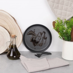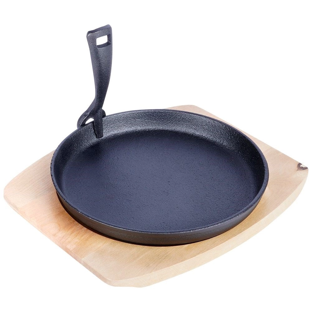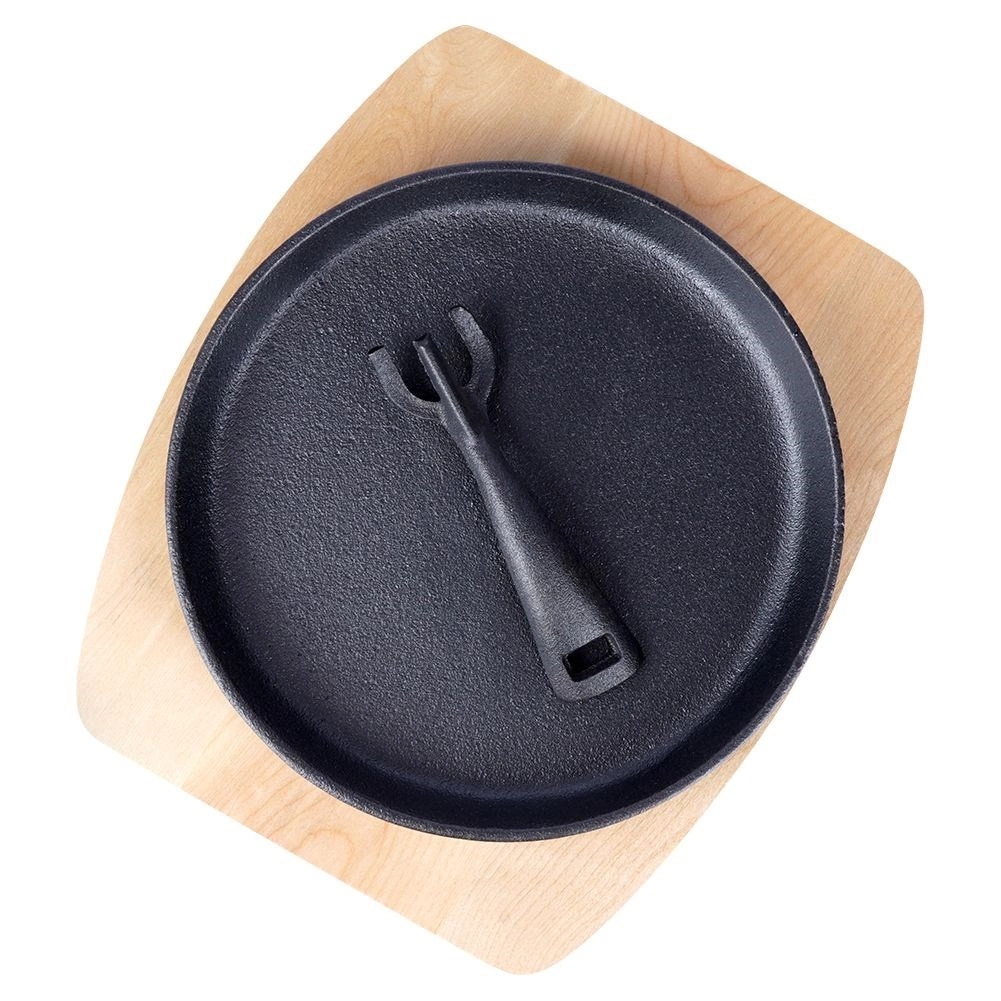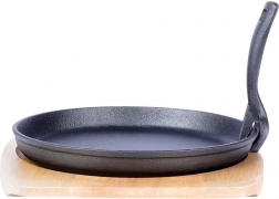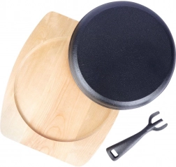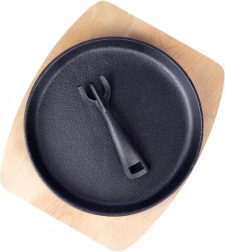 Mânerul practic, detașabil, ușurează manipularea tigăii fierbinți. Suportul din lemn servește ca suport și tavă pentru transportul la masă.