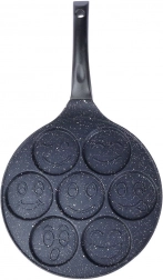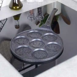 Tigaie din granit, distractivă și practică, cu 7 forme cu diametrul de 8 cm pentru clătite americane uniforme, mini clătite sau ouă. Suprafața antiaderentă Pfluon Granite permite gătitul cu cantitate minimă de grăsime, rapid și fără lipire. Potrivită pentru toate tipurile de plite, inclusiv inducție, cu mâner termoizolat și fără PFOA și PTFE.
