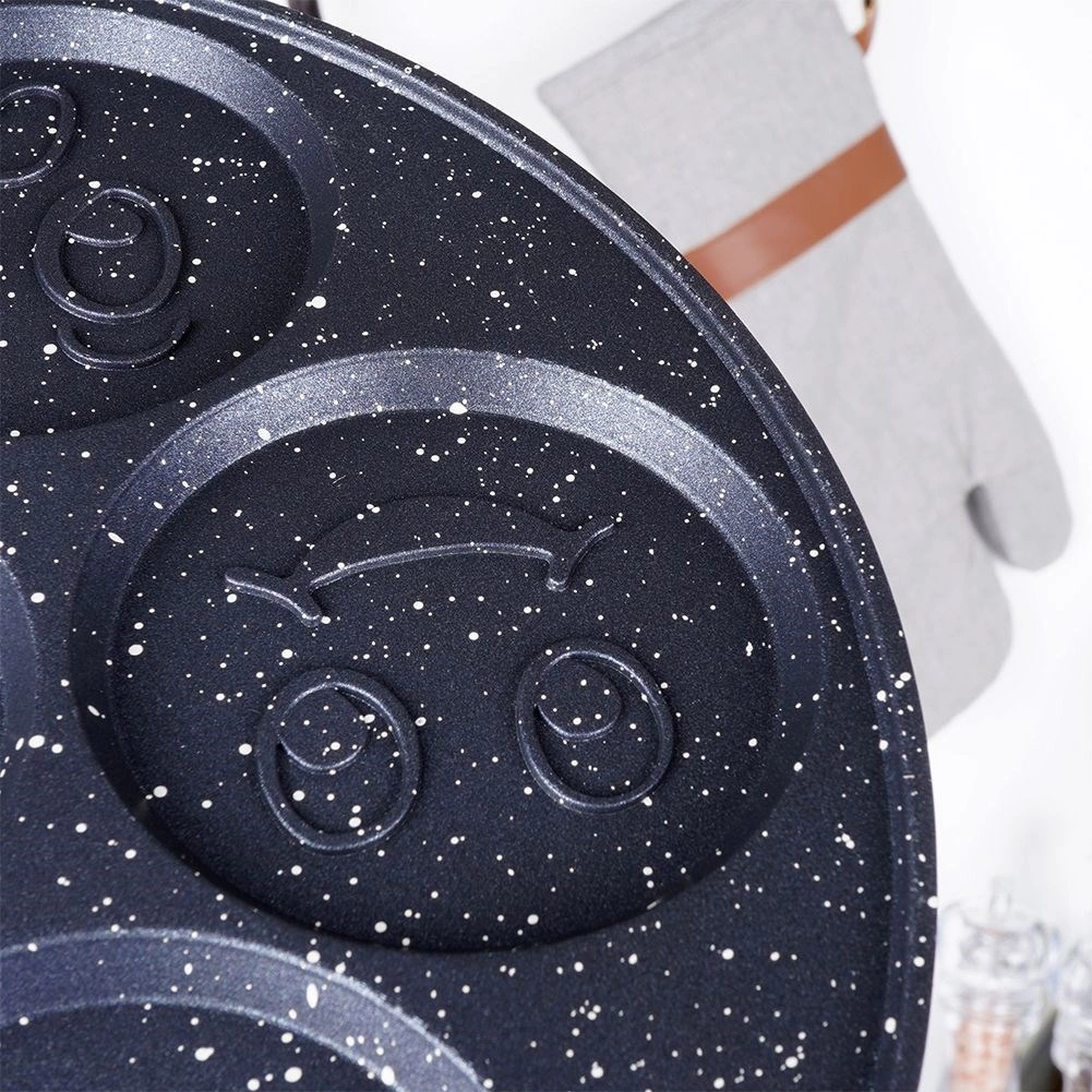 Șapte adâncituri puțin adânci cu motive embosate păstrează aluatul și ouăle în formă și le prăjesc uniform – ideale pentru micul dejun al copiilor sau o gustare rapidă.