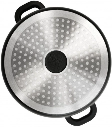 Capacul transparent din sticlă, cu margine din inox și supapă de abur permite controlul gătirii fără ridicări inutile. Datorită bazei pentru inducție, căldura se propagă rapid și uniform, economisind timp și energie. Oala poate fi spălată în mașina de spălat vase și folosită în cuptor (capacul până la 200 °C).