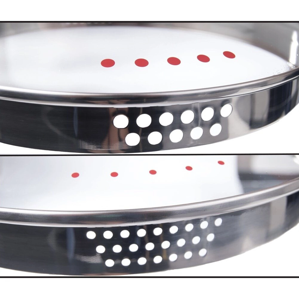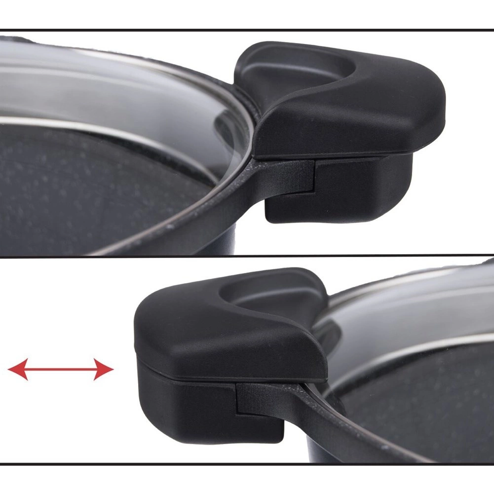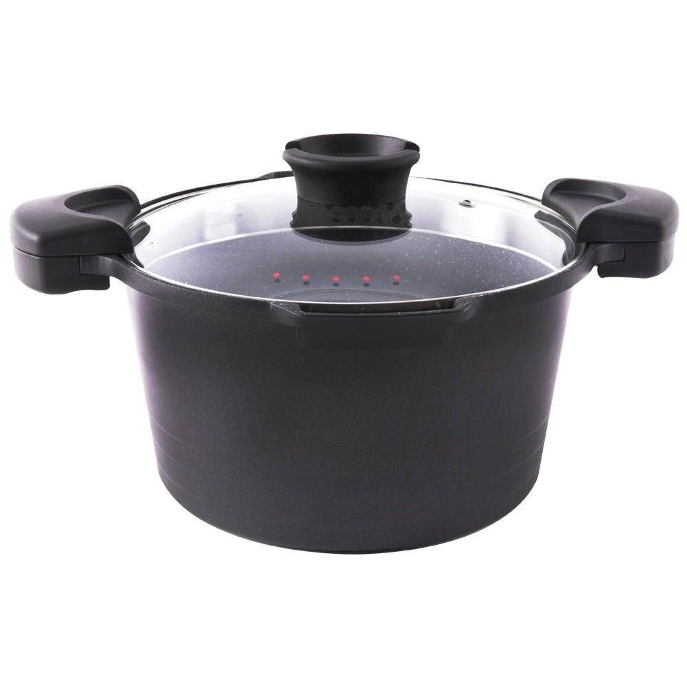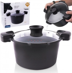 Oala elegantă și durabilă din gama ORION GRANDE îmbină aspectul modern cu funcționalitatea ridicată. Stratificarea antiaderentă din granit este rezistentă la zgârieturi și facilitează gătitul cu o cantitate minimă de grăsime. Capacul din sticlă cu margine perforată permite scurgerea comodă direct din oală, economisind timp și vase.