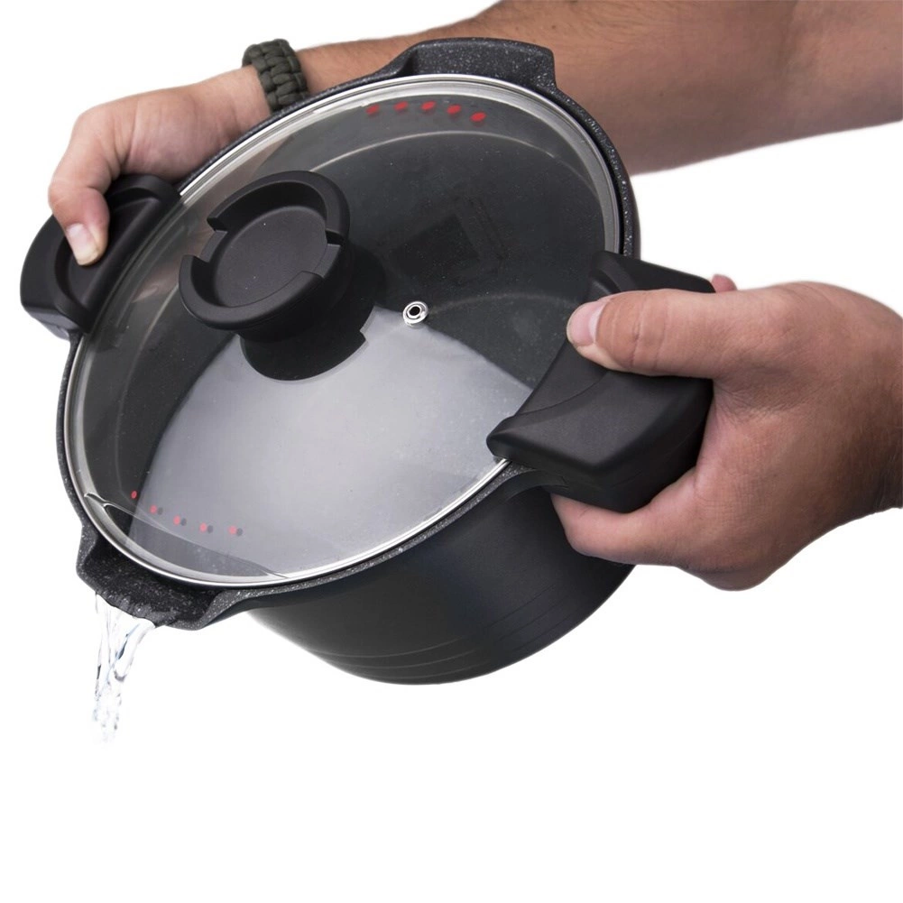 Mânere ergonomice, rezistente la căldură, și guri de turnare pe corpul oalei pentru o prindere fermă și o scurgere controlată.