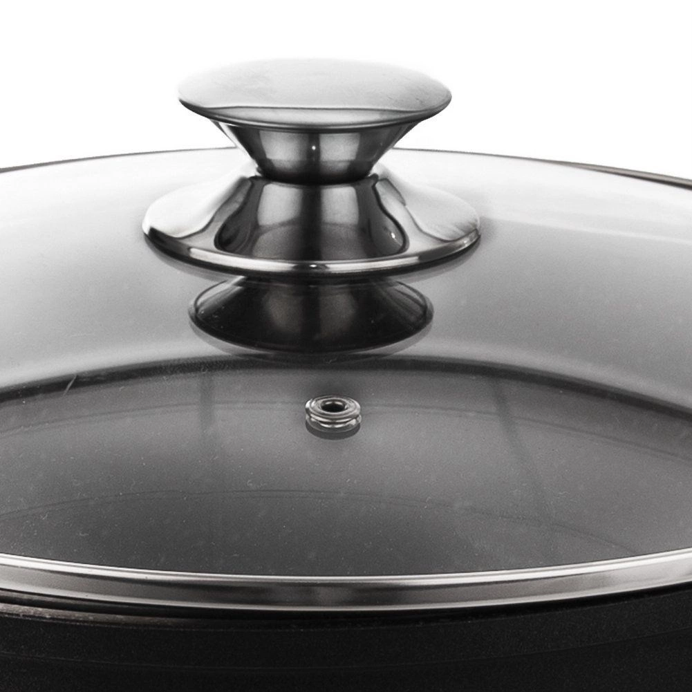 Sticlă călită cu orificiu pentru abur și prinderi robuste pentru o apucare sigură. Tigaia are mâner ergonomic, care nu se încălzește.