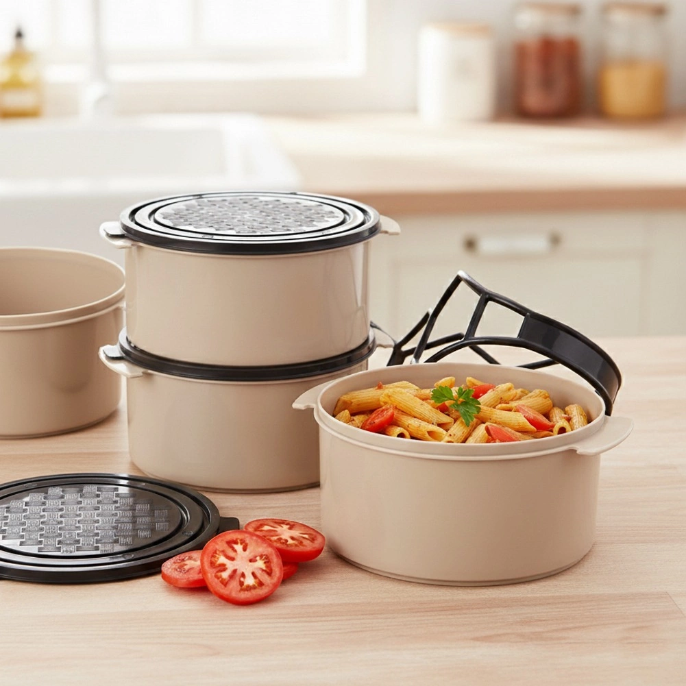 Recipientele se așază ușor unul peste altul, economisesc spațiu și pot fi spălate în mașina de spălat vase. Potrivite pentru frigider, congelator și pentru cuptorul cu microunde fără capace.