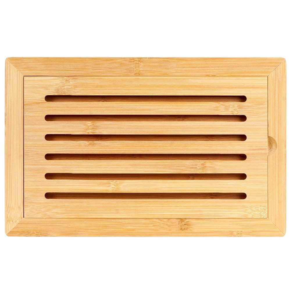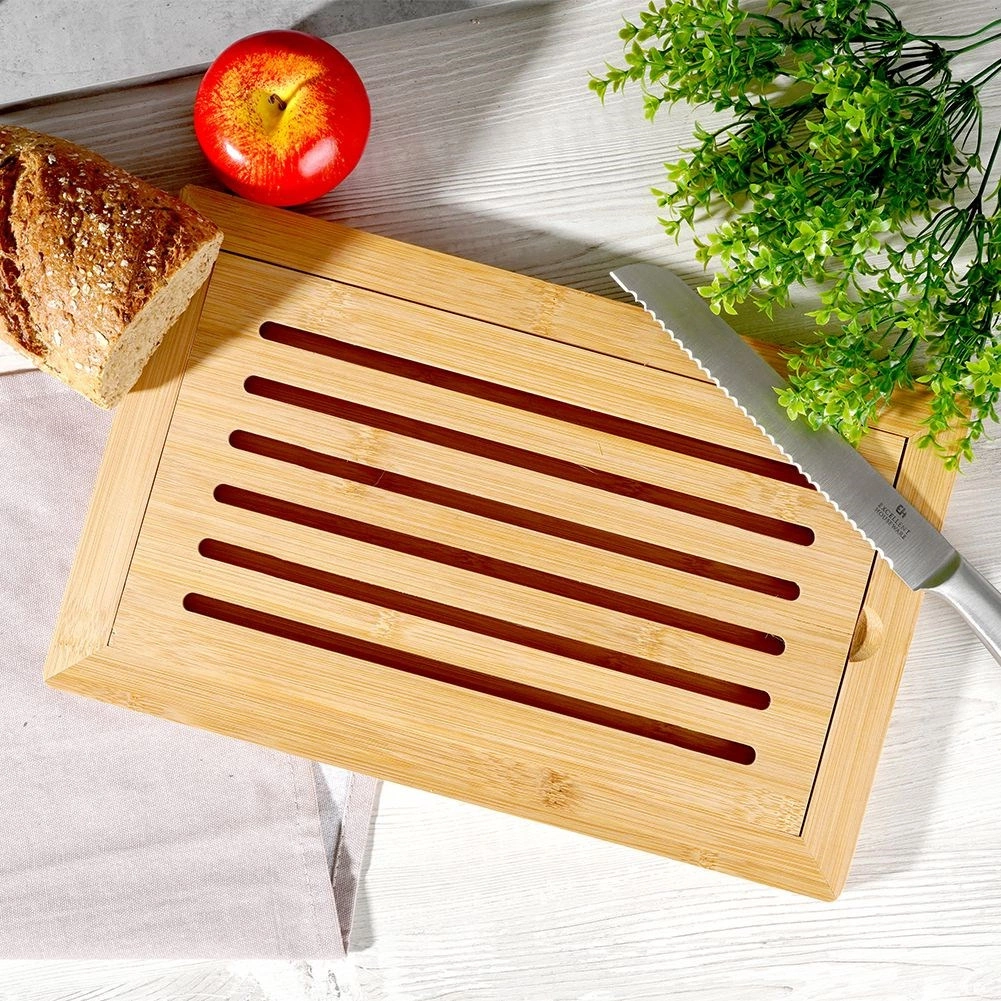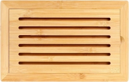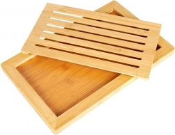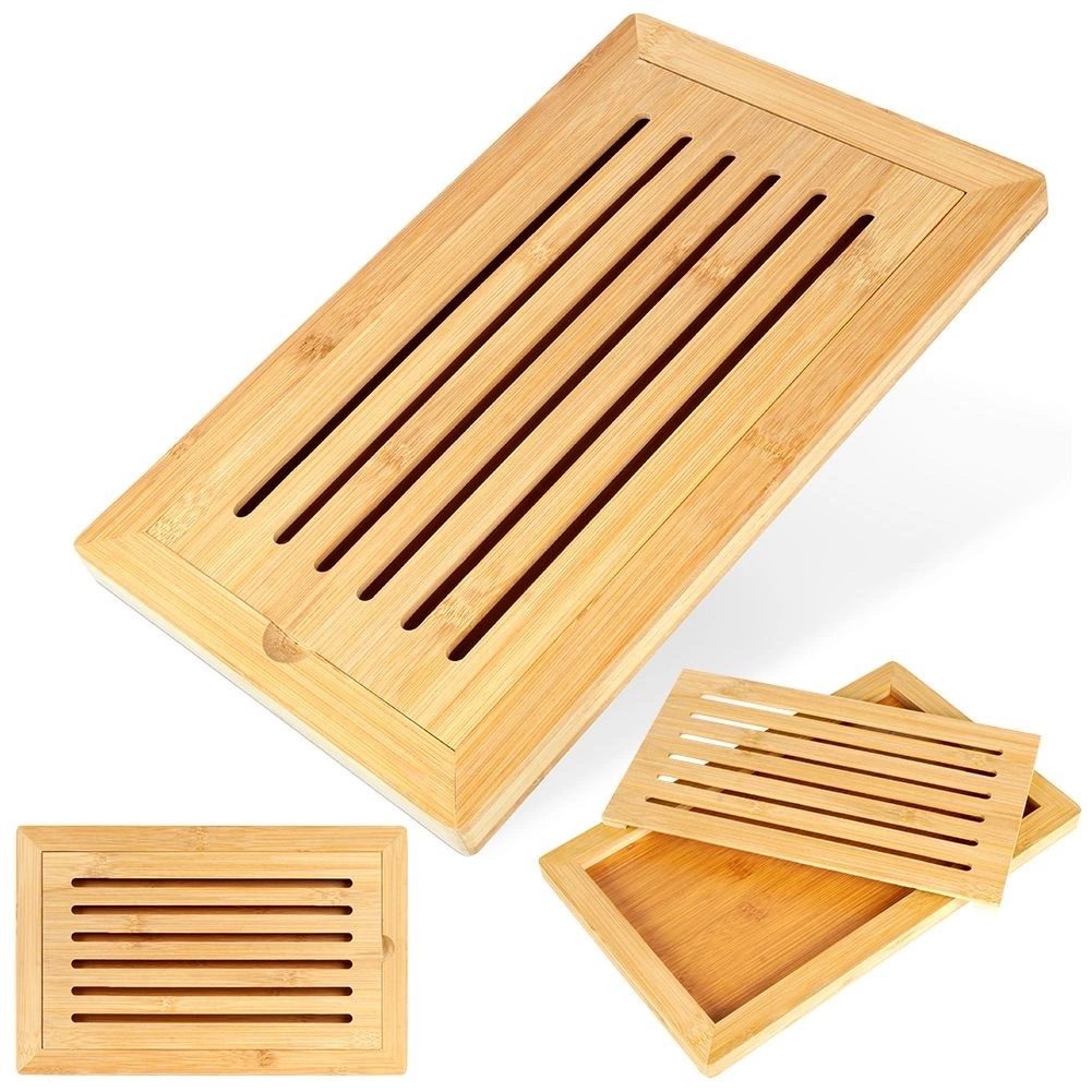 Tocul elegant pentru tăiat produse de panificație, din bambus natural, aduce curățenie și ordine în bucătăria ta. Grătarul superior detașabil permite ca firimiturile să cadă în tava de jos, astfel încât după felierea pâinii este suficient să golești tava și totul este curat. Bambusul este un lemn ușor, rezistent și rezistent la umiditate, care nu absoarbe mirosurile și se usucă rapid.