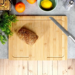 Tocătorul robust din bambus, cu margine în L, este ideal pentru tăierea cărnii, legumelor și produselor de panificație și, datorită suprafeței mari, servește și ca planșetă pentru întinderea aluatului sau pregătirea găluștilor și colțunașilor. Bambusul este ecologic, rezistent la umiditate și deformări, nu absoarbe mirosurile și se usucă rapid.